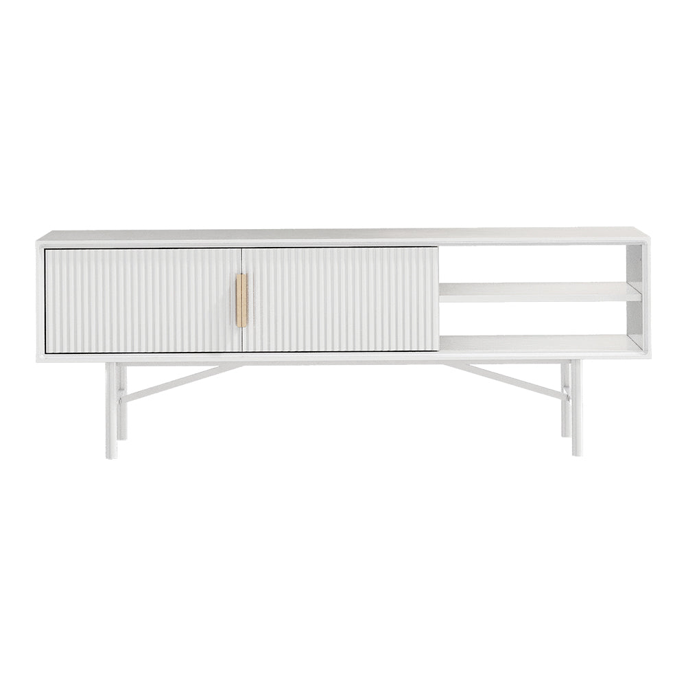 The White Wooden TV Unit with Cabinets combines modern elegance with practical storage. Designed with three-dimensional striped cabinet doors and gold handles, it brings a touch of sophistication to your living room. The open shelves and double-door cabinets provide ample space for media devices, consoles, and accessories, keeping your area tidy and organised. Crafted from durable wood with a smooth white finish, this TV stand offers both style and reliability. Perfect for standing or wall-mounted TVs, it completes any modern home décor beautifully.