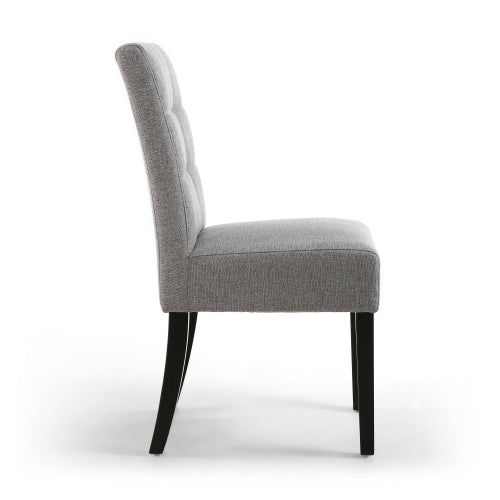 A modern deep seated dining chair with stitched waffle detailing on the back, upholstered in silver grey linen effect fabric. Sprung and belted seat. Available in black rubberwood legs. Assembly required. Sold in boxes of 2.