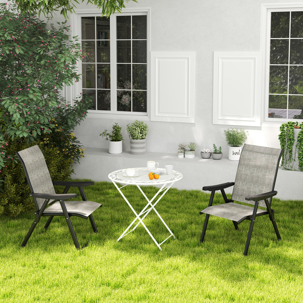 An essential set for garden and outdoor spaces - these two Outsunny outdoor chairs. With 63 cm high backs and armrests for support, the breathable mesh fabric seats hold you comfortably. Using powder coated steel frames for a strong core, these chairs are foldable - carry around and store whenever you want • Set of two chairs: sit outdoors with company