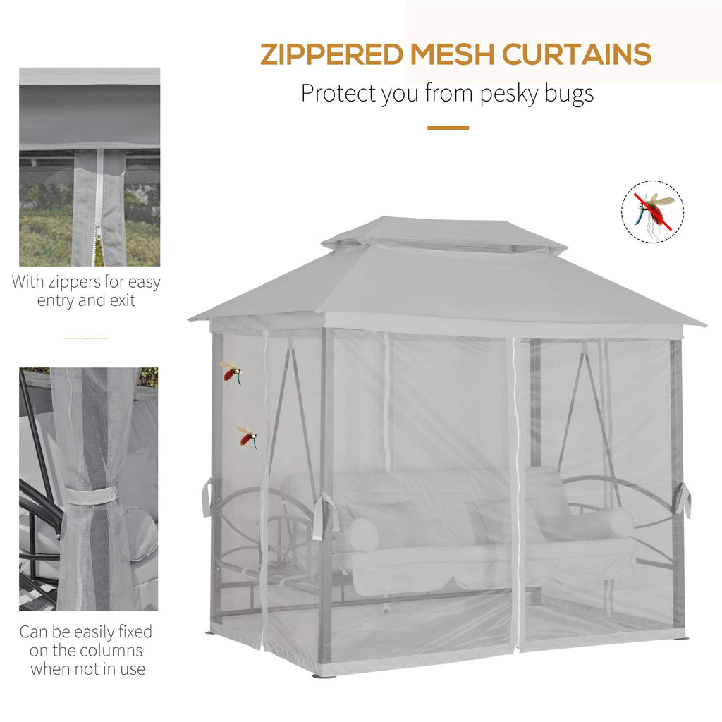 The 3 seaters multi-functional swinging garden chair can be converted to a single bed in seconds. With cushions, two soft pillows and two neck rolls, swing seat with canopy offers optimal comfort whether you are sitting or lounging. The removable zippered mesh curtains on all sides protect you against mosquitoes and allow for fluid air circulation. The gazebo swinging chair bench with a 300kg weight capacity allows you to relax on the comfortable swing chair hammock with your loved ones.• The multi-use swing chair can be easily converted to a single bed in seconds