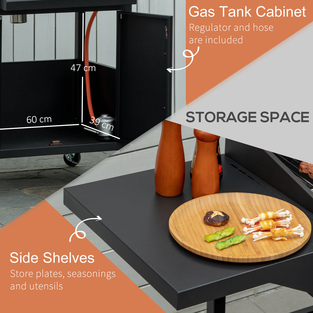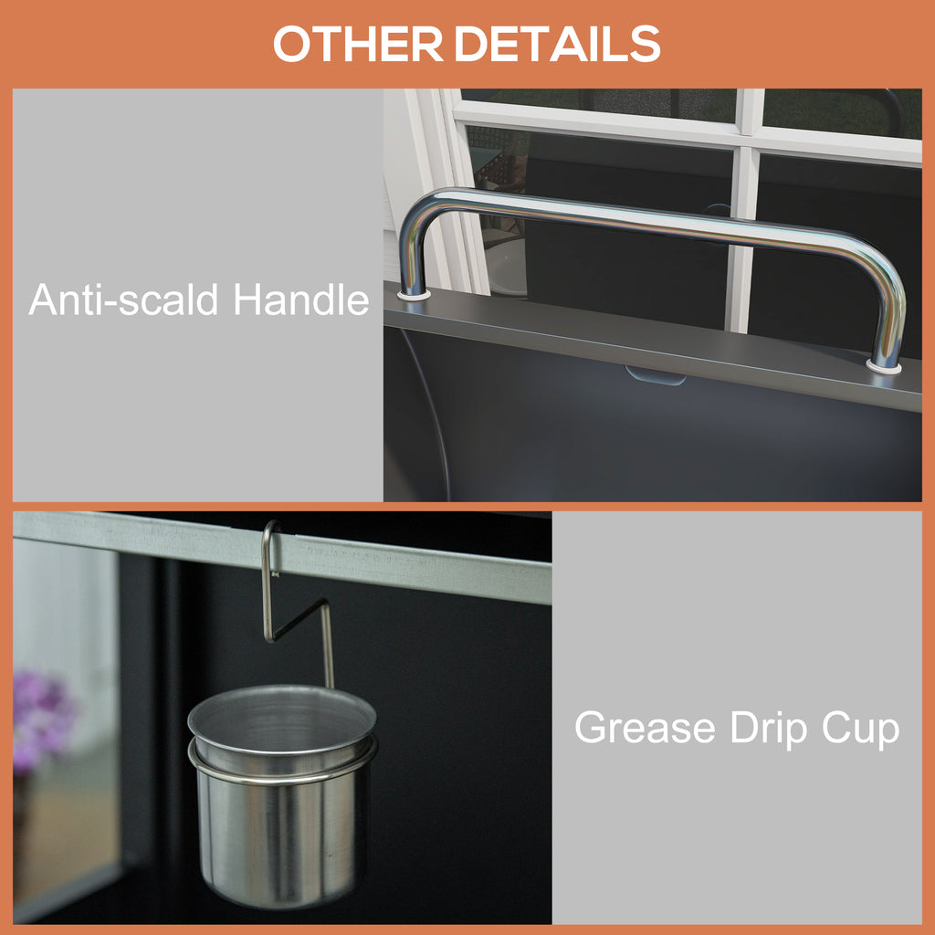 The delicious taste of summer is close with this Outsunny portable gas BBQ for camping. There are four burners to create individual cooking zones - easy to cook a variety of food; paired with the large grill, suitable for hosting big BBQs. Each burner can be turned on easily with the piezo ignition. Unit features two side shelves, top warming rack and bottom cabinet - plenty of room. Pull the lid down when cooking for a smoked effect - finished with a thermometer to see the inner temperature.