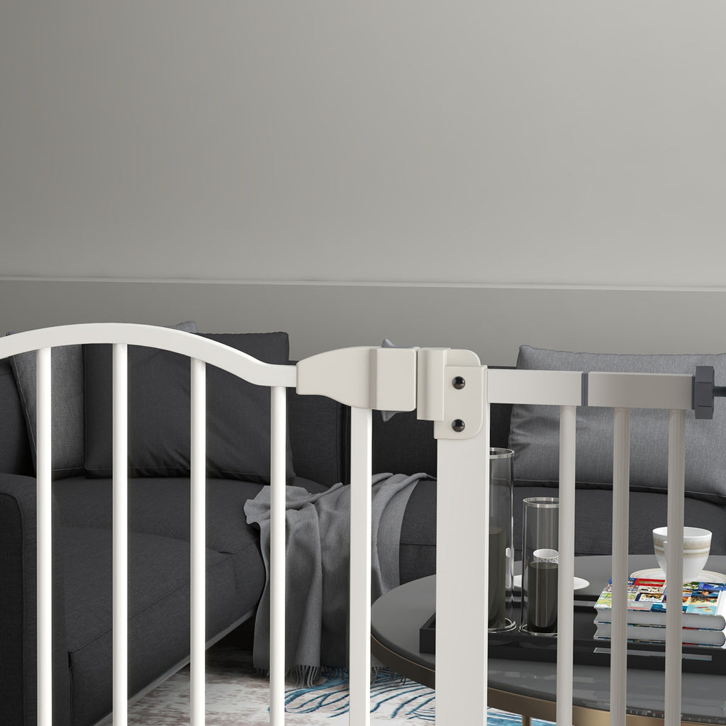 Keep pets away from specific places easily with this safety gate from PawHut. It's made from metal for strength and its width can be adjusted between 74cm and 80cm, meaning it will fit properly in door frames and other passages. Fitted with a middle door to pass when needed, the slide-and-lift handle is easy to use so you can walk through quickly. Two rotating locks on the bottom allow the door to opened both ways, with a double locking mechanism to finish for extra safety.