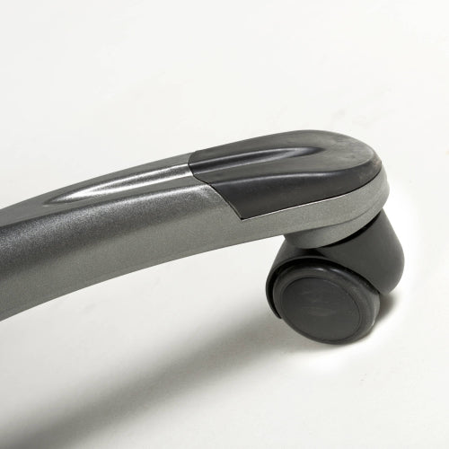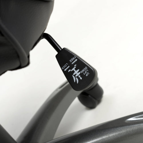 This executive style office chair blends practical functionality with refined design. Upholstered in a classic black genuine leather front, it offers a supple, durable surface. The seat and contoured backrest are generously padded, with segmented cushioning providing ergonomic support. The rear is stitched in matching faux leather. The stylish arched grey fixed armrests are cushioned in matching soft leather. The sturdy five-point polished grey nylon base features contrasting caps and smooth-rolling dual-wheel casters. A gas lift mechanism allows for seat height adjustment up to 10cm, and a tilt-lock function allows the chair to recline. Assembly required. Sold individually.
