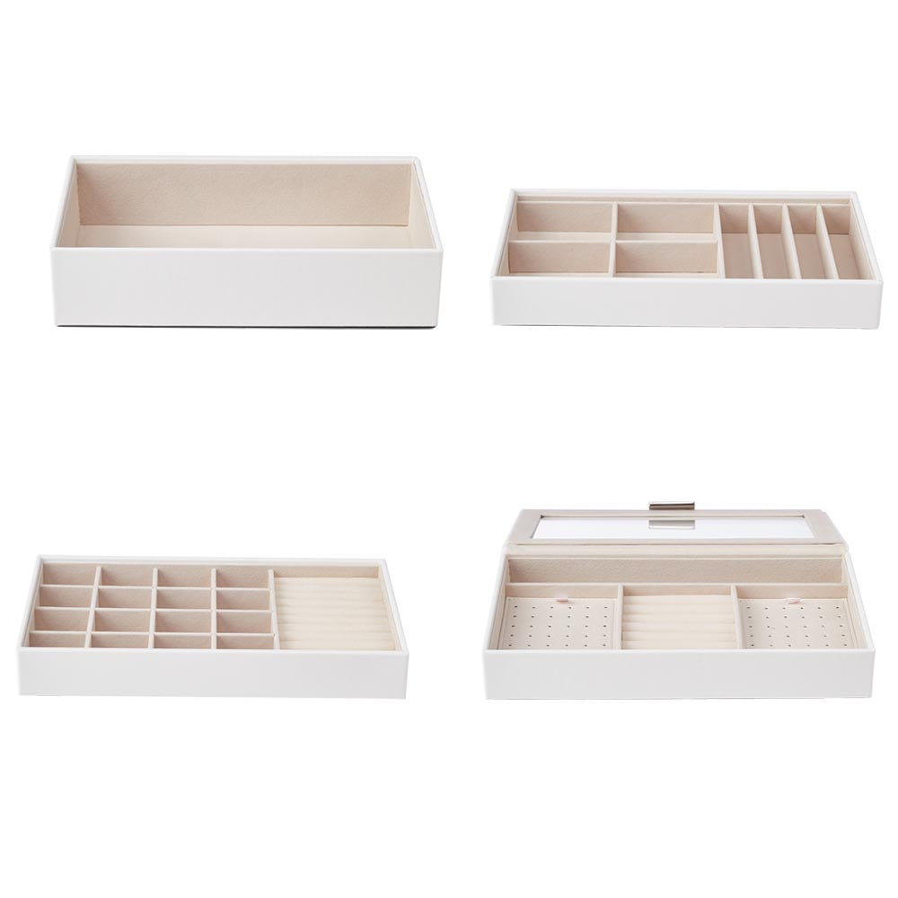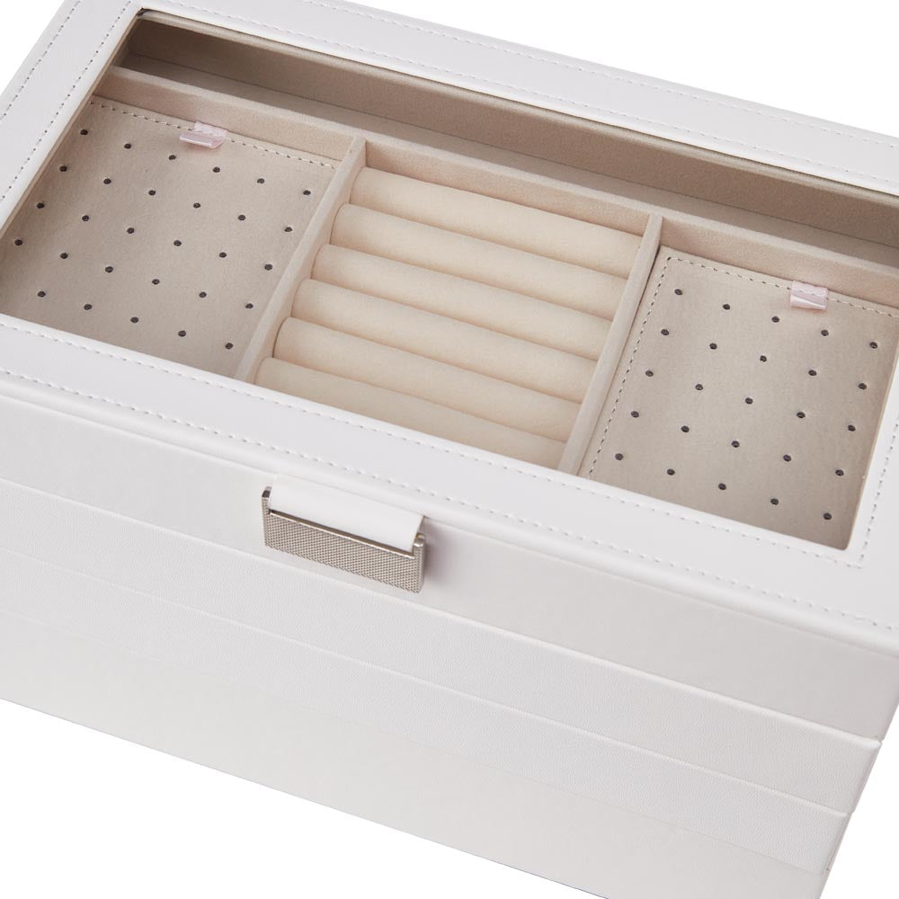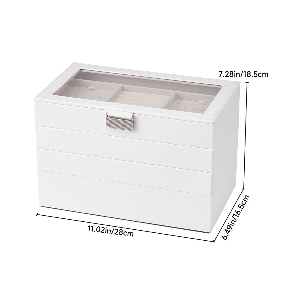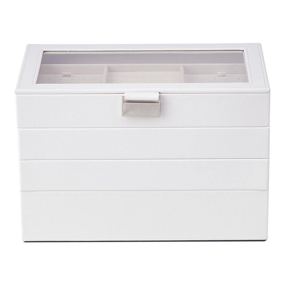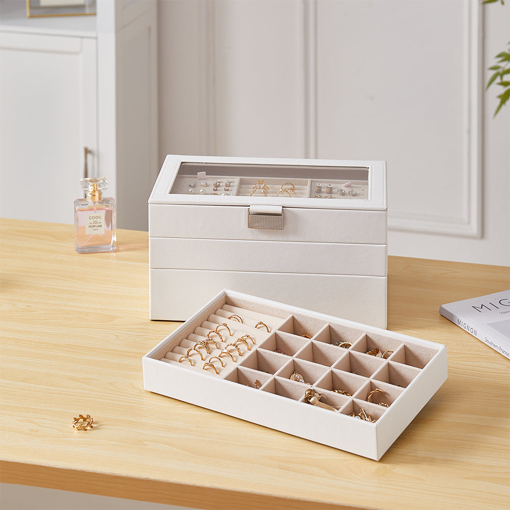 Do not forget the final touch before stepping out â?? accessorise with confidence using this elegant Sheonly jewellery box. Designed with four stackable layers, each featuring its own compartment, it provides ample space to organise and display your cherished pieces. The transparent lid keeps your jewellery dust-free while allowing you to view your collection at a glance. With a simple yet refined design, this box ensures your accessories remain beautifully presented and easy to access, adding a sophisticated touch to your dressing area.