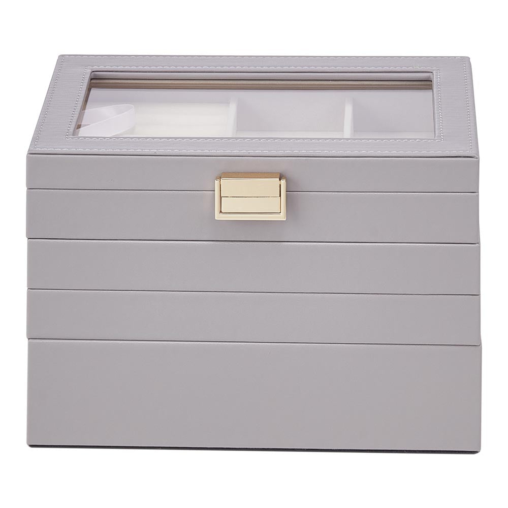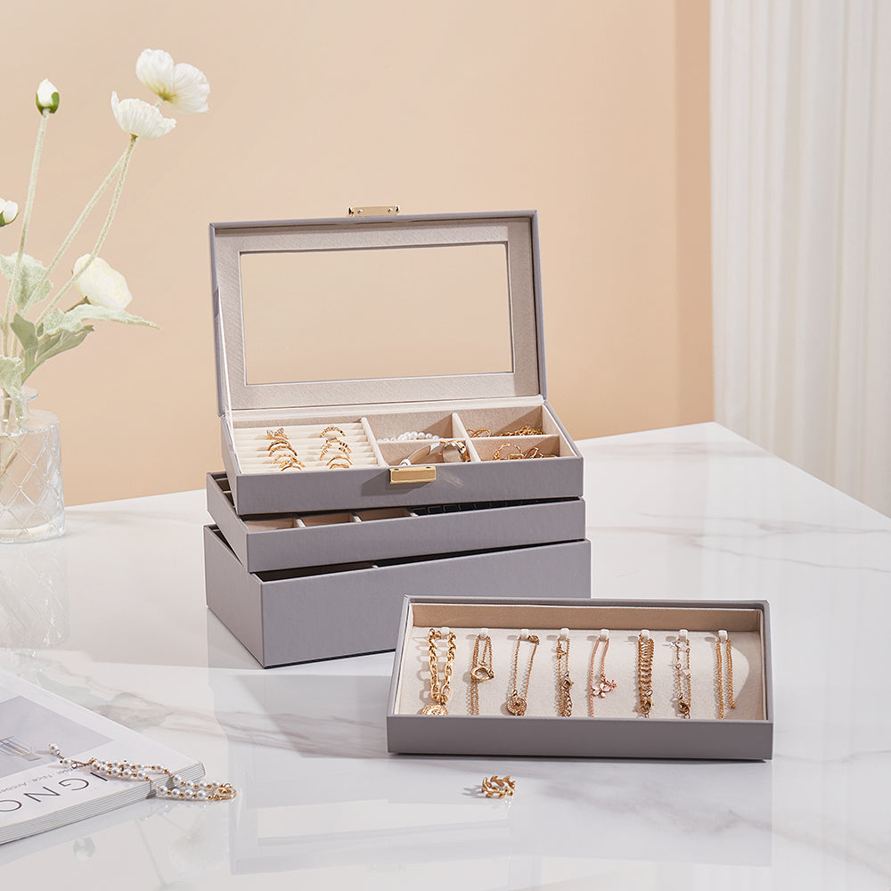 Keep your treasured jewellery organised and beautifully displayed with the Sheonly Jewellery Box. Featuring four spacious tiers, each with its own compartments, this elegant box allows you to store and showcase rings, necklaces, earrings, and bracelets at the same time. The stackable layers can be used together to save space or separated to fit neatly into a drawer. A transparent lid protects your collection from dust while providing a clear view, combining practicality with a refined, stylish design.