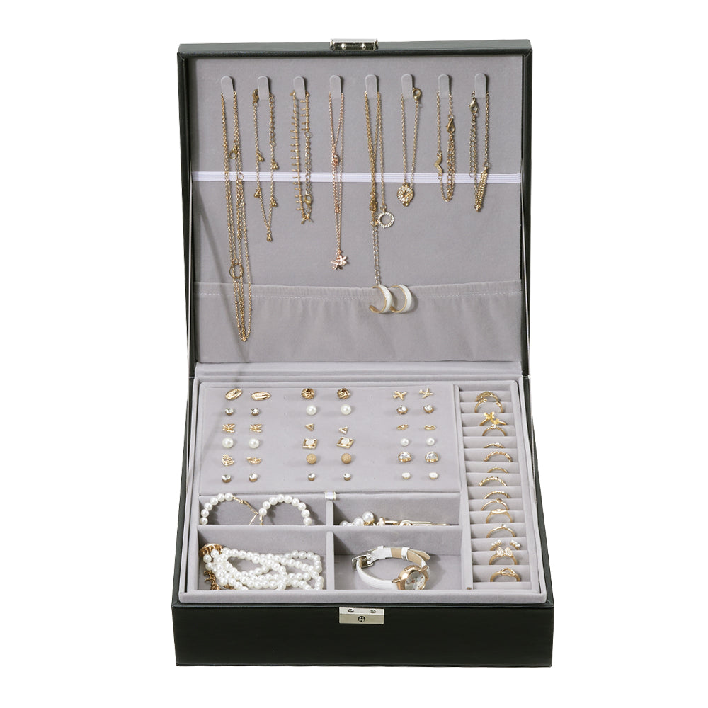 -Two-tier storage with separate compartments for rings, necklaces, and earrings