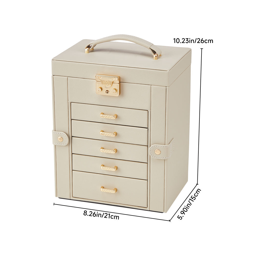 Enhance your jewellery storage with this elegant jewellery box, featuring a refined faux leather exterior and a soft light pink velvet lining. The gold lock and handle add sophistication, while the top layer provides slots for rings and earrings, along with two side compartments for necklaces. A mirror on the lid allows for convenient accessorising, and the drawer below includes built-in compartments to keep all your precious pieces organised and easily accessible.