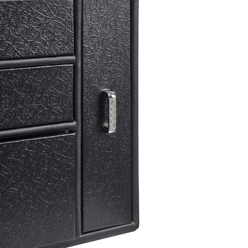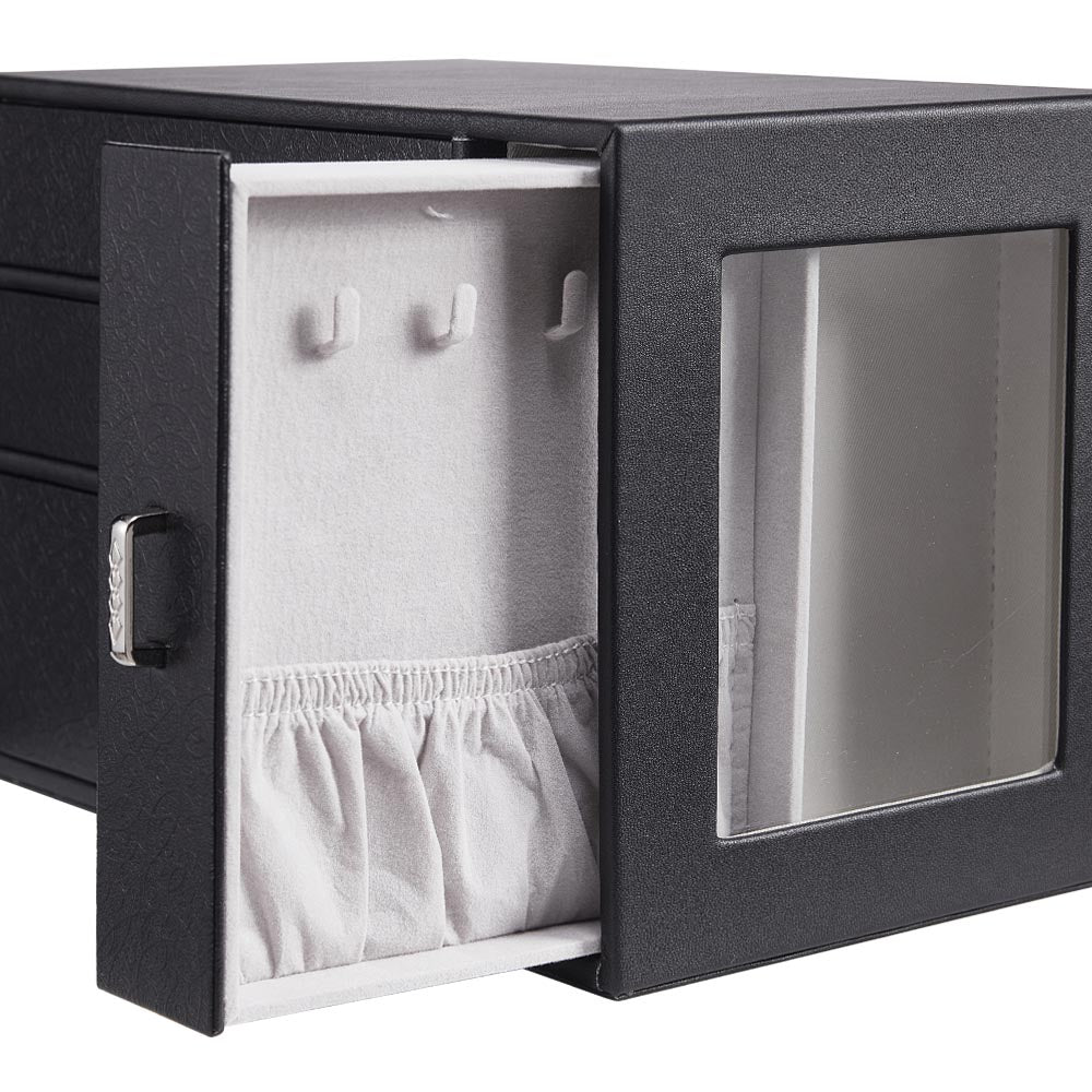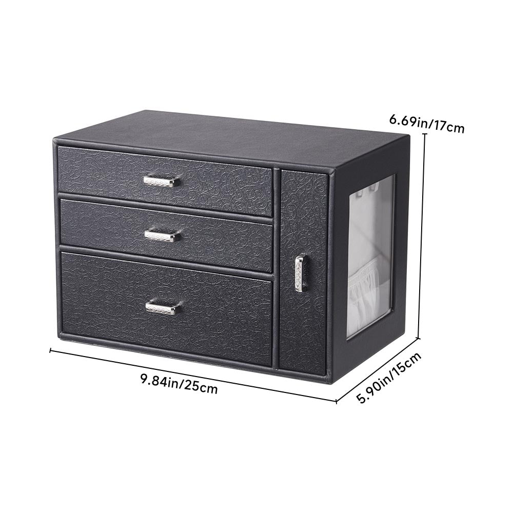 Ideal for minimalists, this jewellery box keeps your precious pieces organised and in pristine condition. Featuring a sleek finish and high-grade glossy drawer handles, it includes three drawers plus a vertical pull-out drawer specifically for necklaces, ensuring they remain tangle-free. A transparent display window allows you to easily view your collection, while the compact design makes it perfect for desktops, optimising space without compromising style.