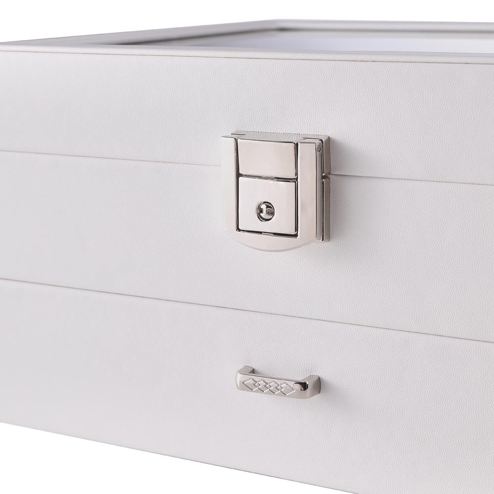Crafted entirely from leather, this jewellery box exudes sophistication and elegance. The transparent lid provides a clear view of your collection, making it easy to access and display your treasured pieces. With ample storage space, it features four watch slots, a row of ring slots, various compartments of different sizes, and a drawer with additional compartments at the bottom. Perfect for a dressing table or bedside table, this jewellery box adds a stylish and organised touch to any space.
