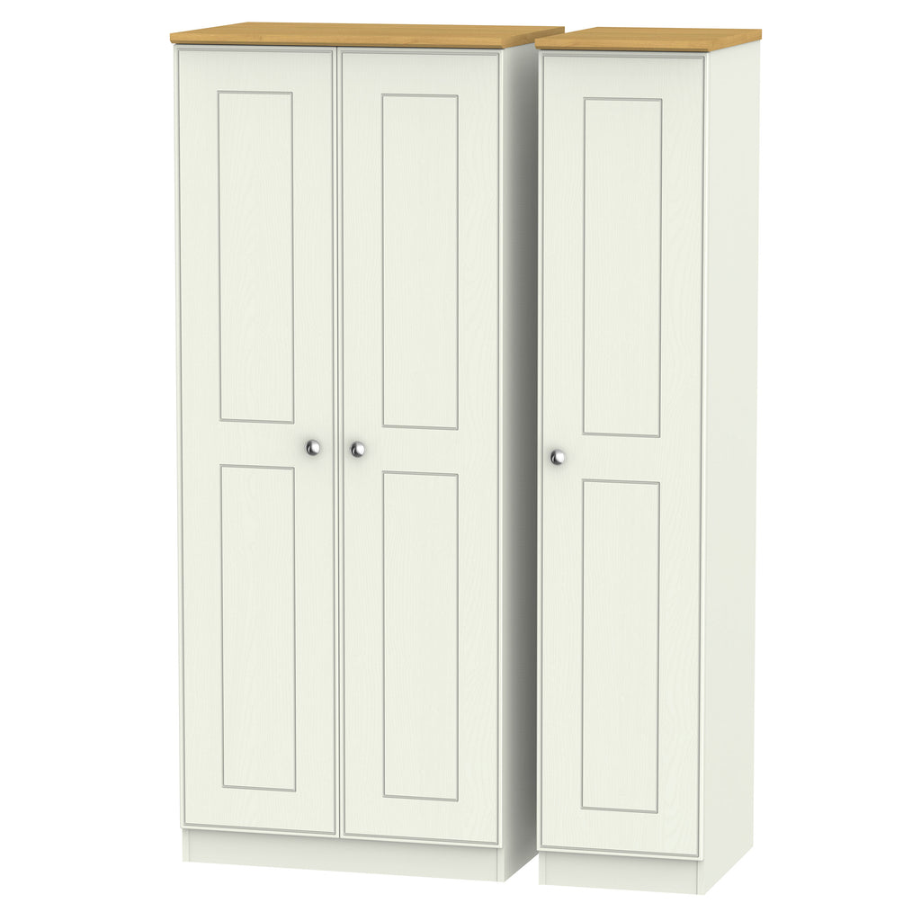 (Dimensions: H182 x W111 x D53cm) This full height triple 3 door wardrobe is perfect for any bedroom when a normal wardrobe is just not large enough. It's easy to create a bedroom that showcases effortless chic, with this stylish range. The shaker-inspired design exudes understated luxury, each piece is finished in a number of colours with brushed steel handles and the option of a contrasting oak effect top. A well-thought-out mix of hanging and flat storage that's suitable for any room. All our furniture is made in the United Kingdom, to the highest quality. It is delivered direct to your location of choice by one of our two man delivery teams, and comes fully assembled (although legs may be removed to prevent damage in transit).