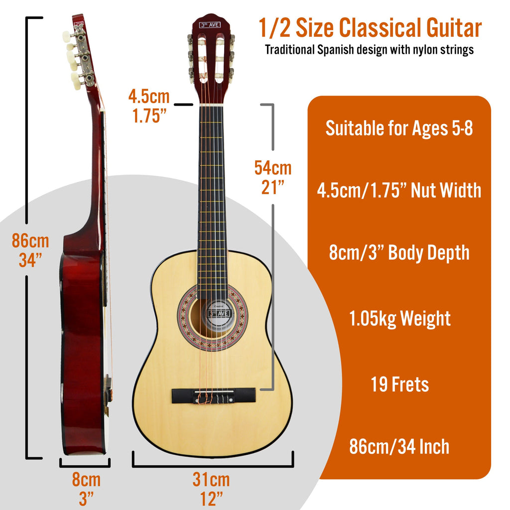 The 3rd Avenue Classical Guitar pack is ideal for younger players to get learning on. Coming with some essential accessories and being easy on the fingers these are perfect to start your musical journey. Being half sized means that this model is suitable for ages 5 to 7 years old.