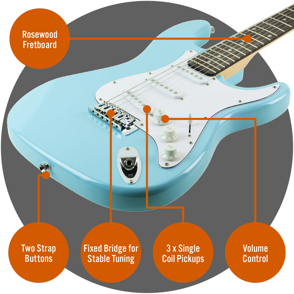 The full-size right-handed guitar features 22 frets, a smooth rosewood fretboard and three single-coil pickups, offering a comfortable feel and a versatile range of tones suitable for different styles of music. Built to a reliable standard, it is well suited for classroom use as well as at-home practice.