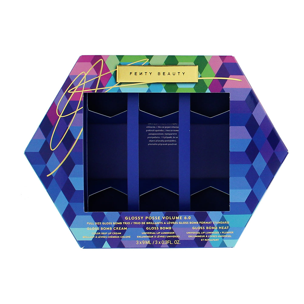 Fenty Beauty Glossy Posse Vol. 6 Bomb Gloss Trio is a limited-edition collection of Fenty's cult-favorite Gloss Bomb Universal Lip Luminizers, featuring three stunning shades that deliver explosive shine, luscious colour, and a non-sticky feel. Each gloss is infused with shea butter to condition and smooth lips, leaving them soft, hydrated, and irresistibly glossy.