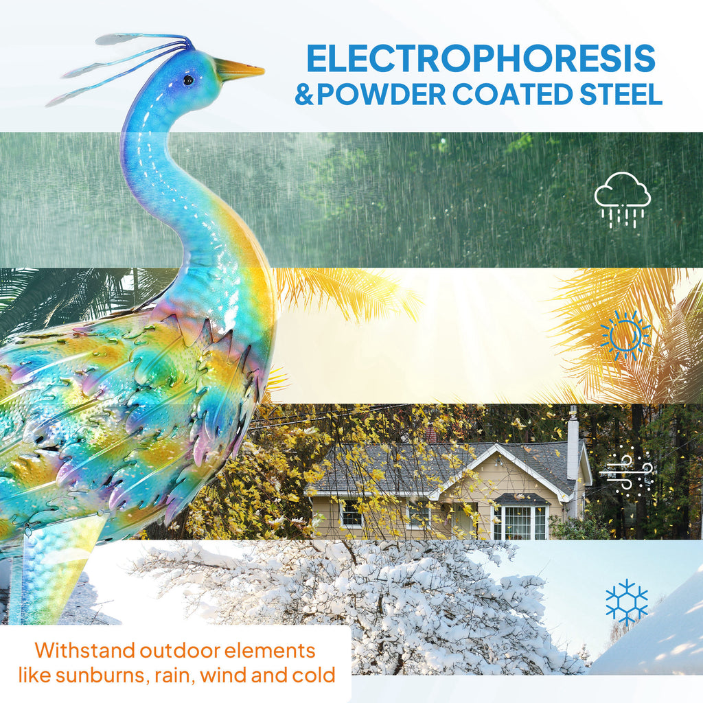 A bit monotonous in the garden? Looking for an eye-catching decorative piece? Let Outsunny garden art sculpture lights up your garden. Bright colours and vivid details. Built to withstand outdoor elements, this metal garden statue undergoes electrophoresis and powder coating processes, while its stable standing is enhanced by two U-shaped ground stakes.