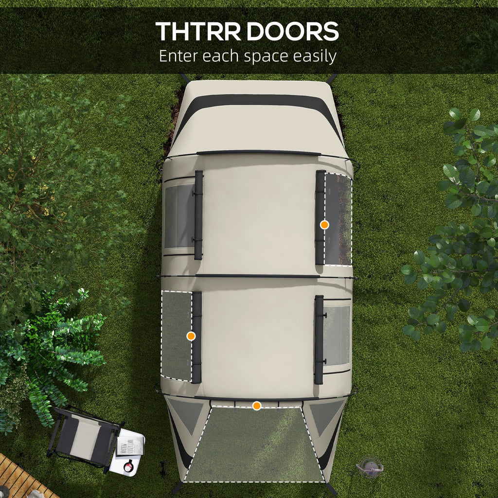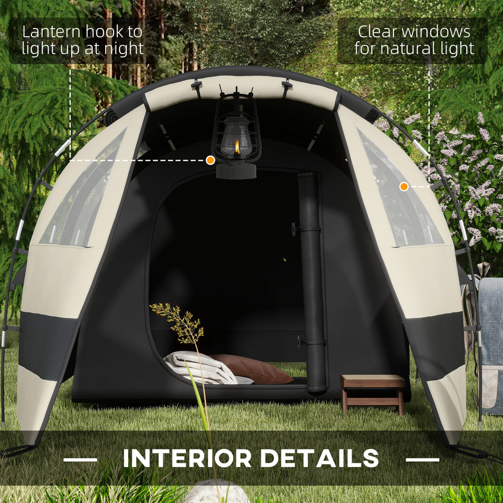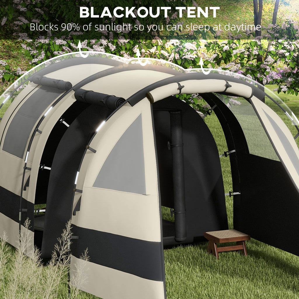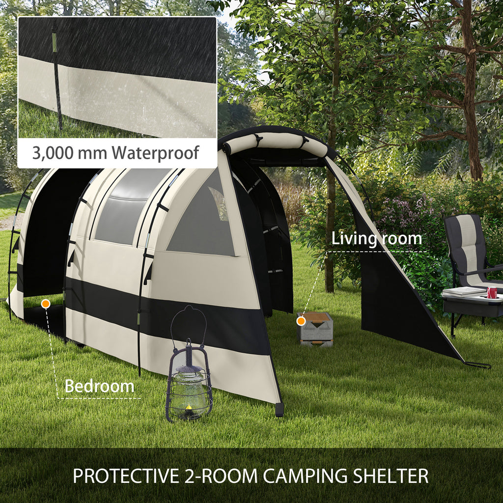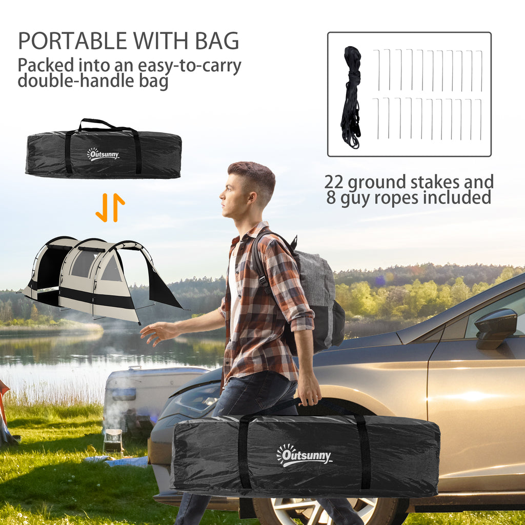 Share the fun of your camping with company. This Outsunny four man camping tent comes with a bedroom and living room. Fibreglass poles mean a tough and resilient core, so this large tent stays in shape. The waterproof tent protecting up to 3,000mm of rainwater. Doors to enter each space easily. This tunnel tent includes 22 x ground stakes, 8 x guy ropes and a carry bag.