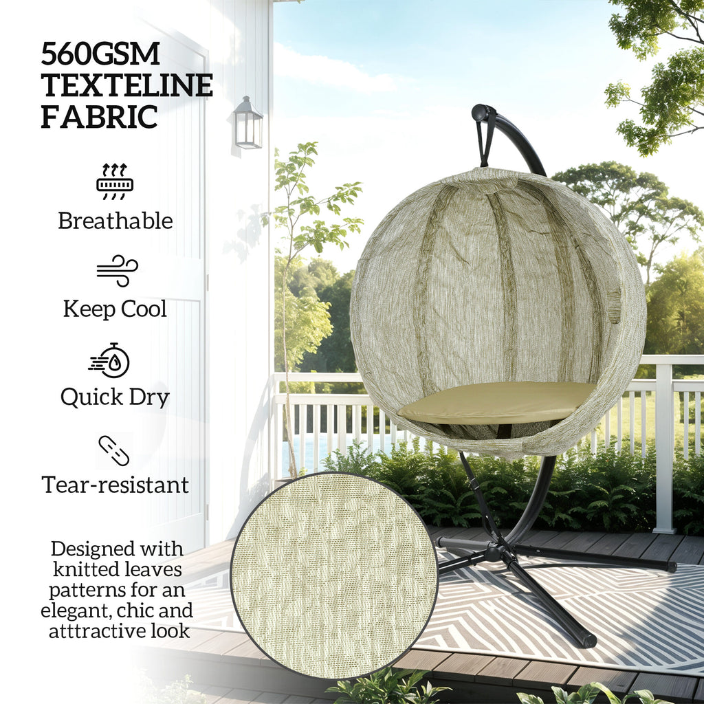 Unwind in stylish comfort with the Outsunny outdoor egg chair! With a wide seat covered in leaves-pattern texteline fabric, this egg garden chair offers cosy, bird-nest-like retreat. Enjoy cloud-like relaxation with a thick 13cm cushion and a bottom cushion. The foldable basket makes storage effortless and a built-in cup holder keeps your drink within easy reach. With a powder-coated steel frame and four-leg base, this swinging egg chair offers stable, lasting support for your outdoor leisure.