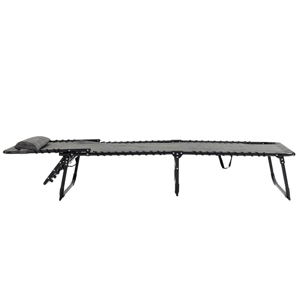Lounge outdoors the classic way - go for this folding recliner from Outsunny. Sturdy steel frame supports up to 120kg. The back can be adjusted to five positions to relax at a position you want. There's a mesh fabric seat stretched on the frame to hold your body, with a removable pillow on the top to support your head/neck and keep it comfortable. Easily folded into a compact size, making it easy to carry and store. A perfect piece to put in your car for those weekend beach trips.