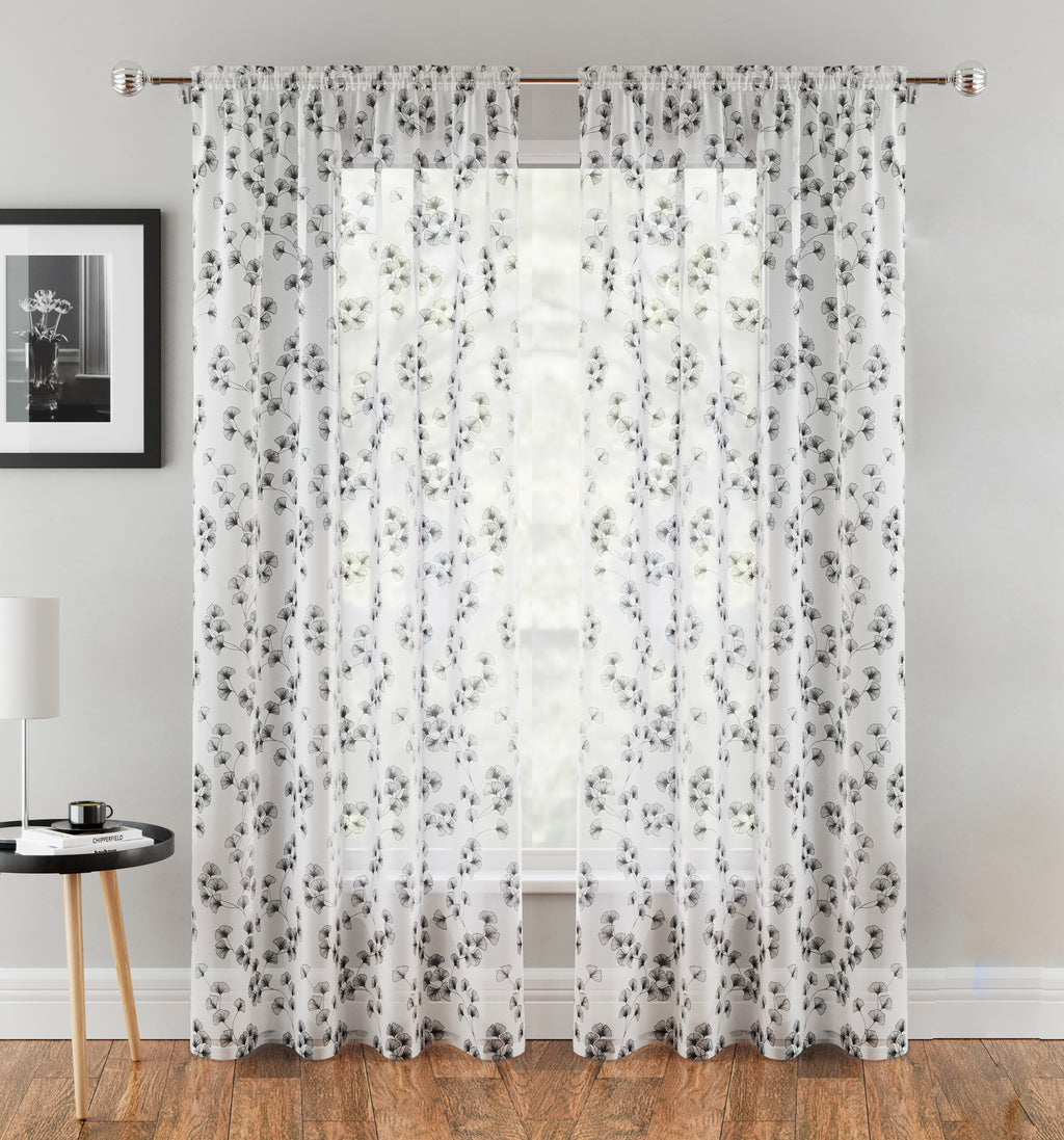 Delila is a sheer voile panel with a beautiful, all over, gingko leaf print. The rod pocket header allows for easy hanging, perfect for all living spaces. Available in 3 colours.