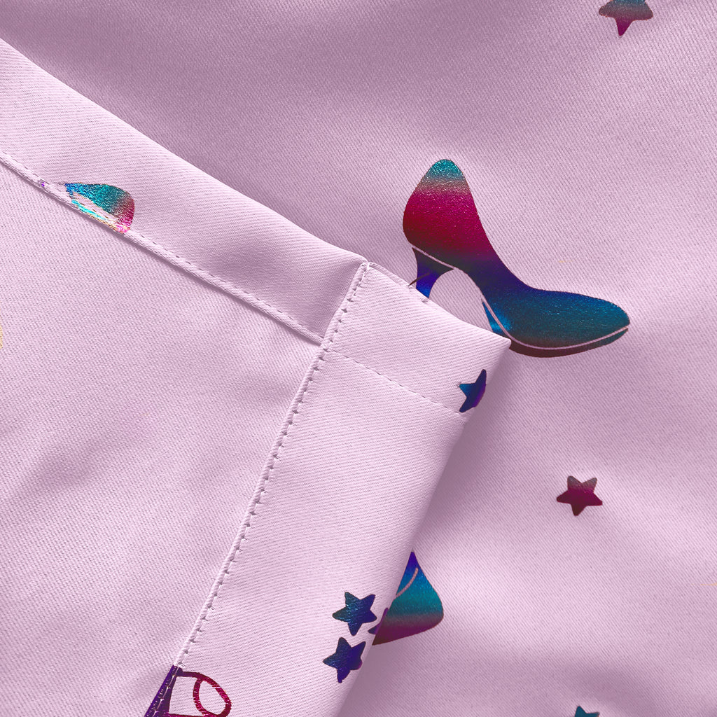 Introducing Charm, kicking off our brand-new range of kids curtains! Designed to ignite imagination and inspire dreams, Charm brings the wonders of your child's imagination to life. Incorporating a mesmerising iridescent metallic pattern of unicorns, handbags, lipsticks, high-heels, and crowns to suit a range of hobbies. With room darkening properties these curtains allow for a restful night's sleep while reducing noise and saving on your energy bills. The eyelet heading allows for easy installation effortlessly transformation the room. Check out Infinity for a similar blue metallic curtain!