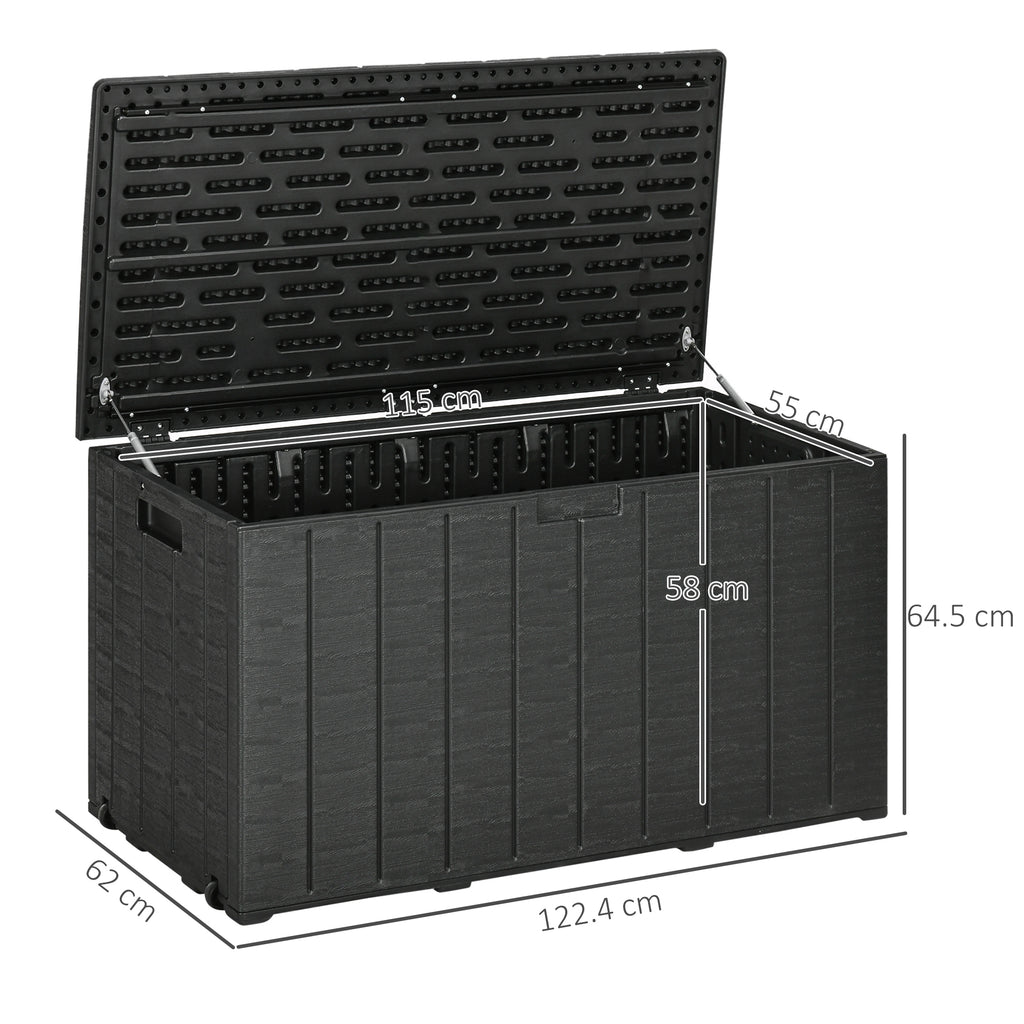 Tough and beautiful outdoor storage comes in the form of this Outsunny piece. The 366 litre capacity, sized at 122.4cm x 62cm makes it a generously-sized piece: plenty of holding room for garden accessories, tools and more. Made from plastic in a double-wall construction, this box is strong, with a smooth-opening lid to make everything easy for you. Comes with two handles and rollers so you can move it around easily, whether empty or full.