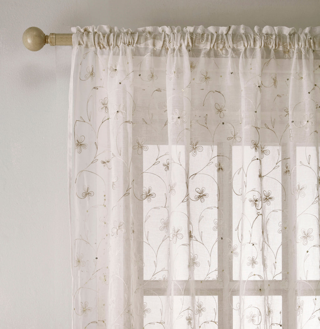 Pair of Belle Cream Sheer Floral Embroidery Voile Panels with Rod Pocket Header