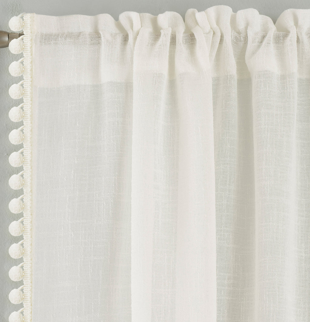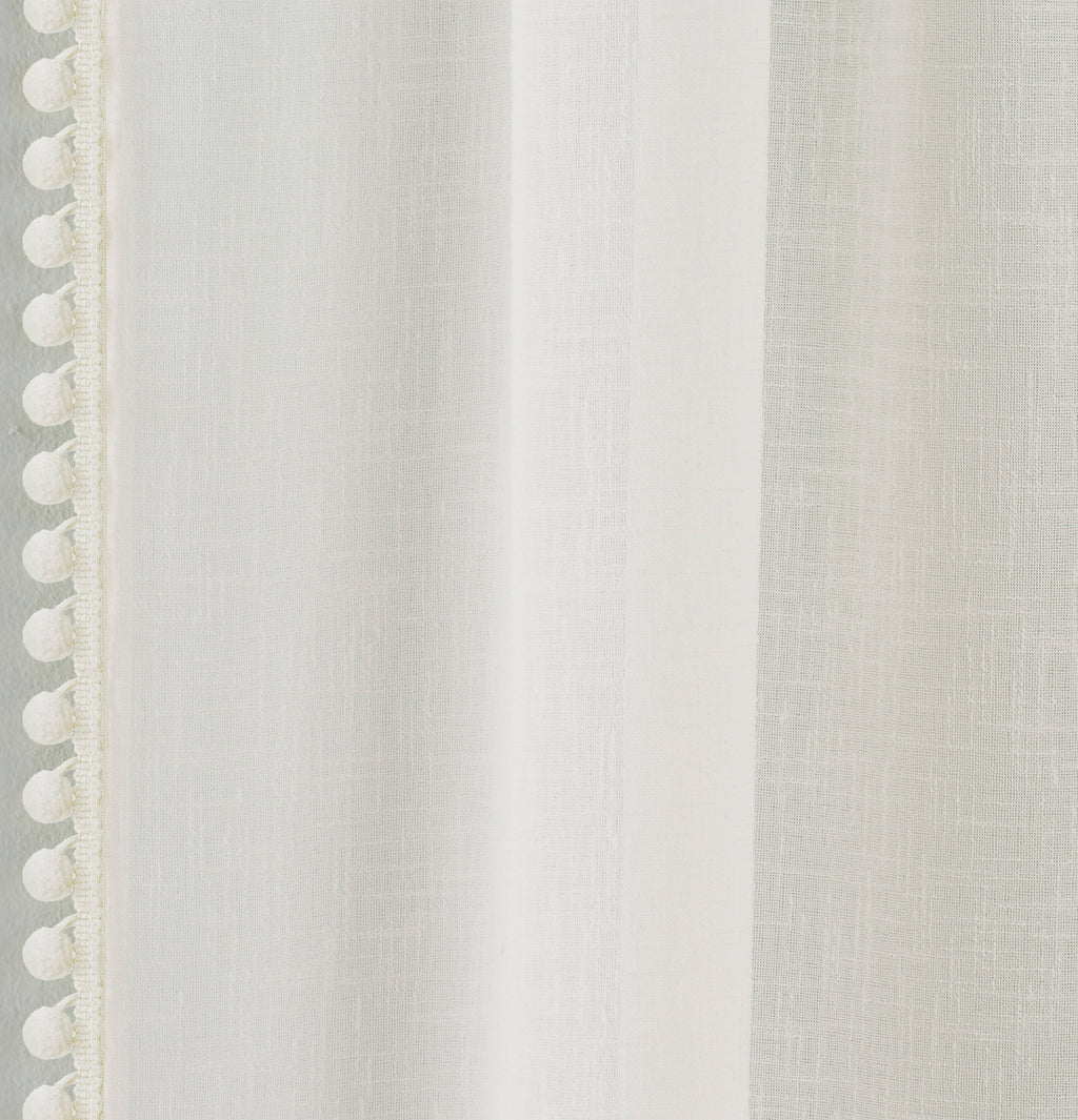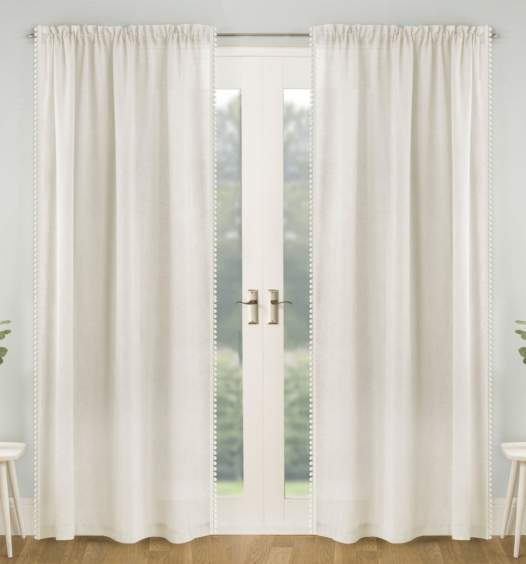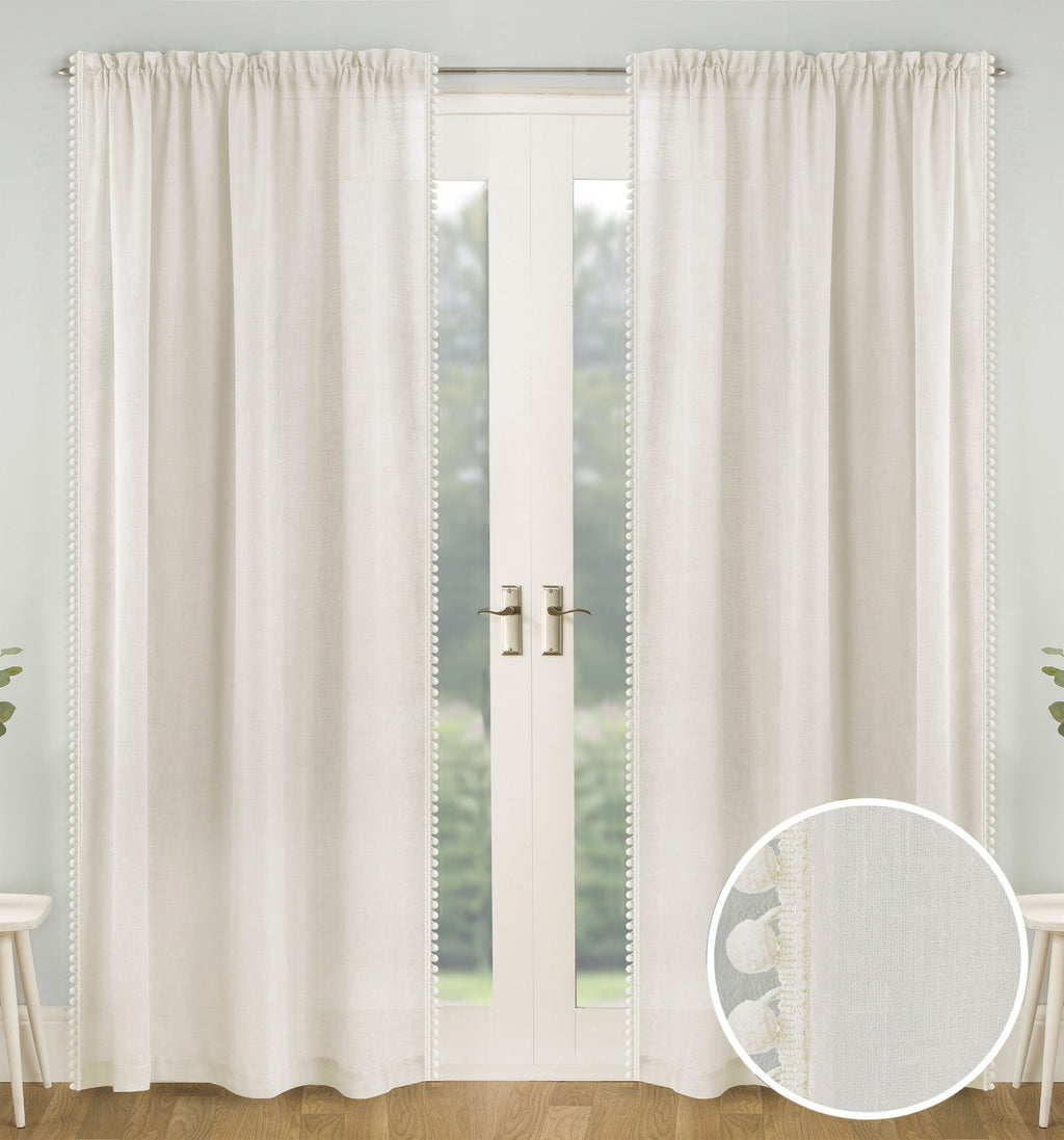 Pair of Tahiti Cream Pom-Pom Trim Linen Look Voile Panels with Rod Pocket Header