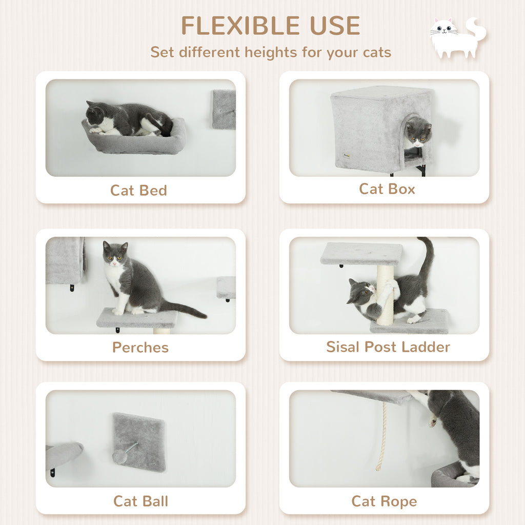 Transform your home into a feline paradise with the PawHut cat wall furniture! This chic 6-piece set includes a condo, plush cat bed and multiple platforms, all designed to indulge your cat's instincts to climb and rest. The sisal scratching post and toy ball keep them entertained, while the sleek wall-mounted design enhances your decor without taking up floor space.