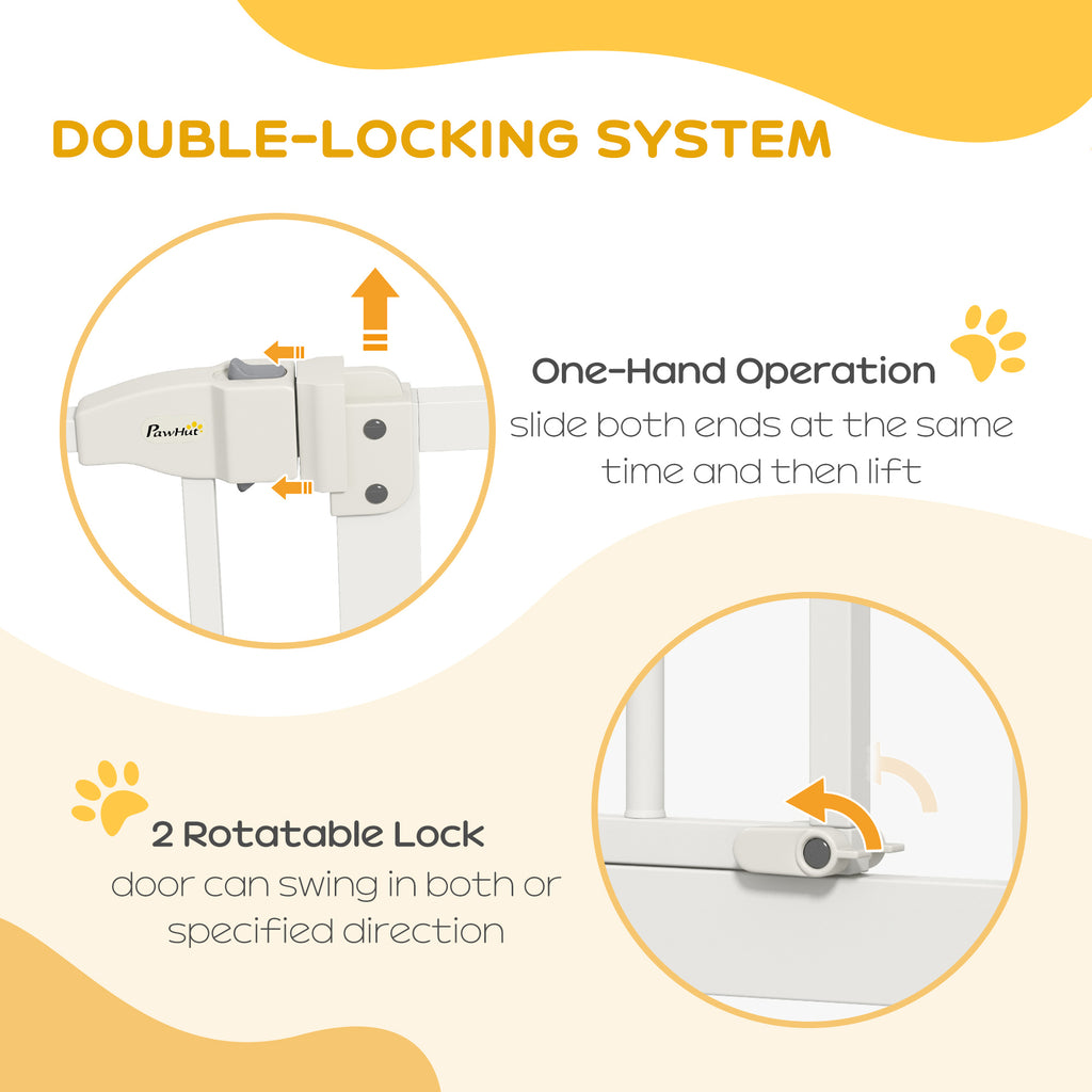 Keep pets away from specific places easily with this safety gate from PawHut. It's made from metal for strength and its width can be adjusted between 74cm and 87cm, meaning it will fit properly in door frames and other passages. Fitted with a middle door to pass when needed, the slide-and-lift handle is easy to use so you can walk through quickly. Two rotating locks on the bottom allow the door to opened both ways, with a double locking mechanism to finish for extra safety.
