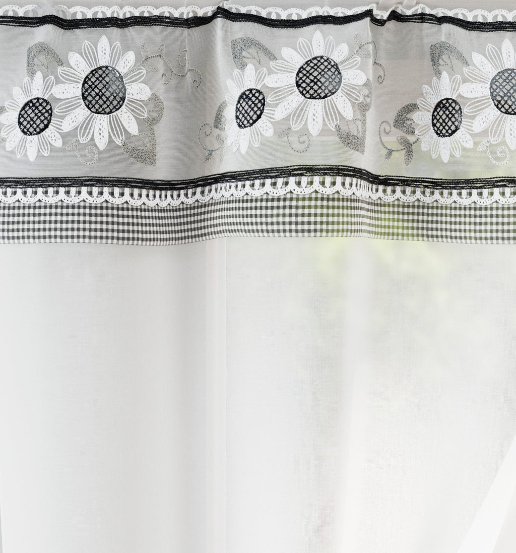 Brighten up your home with the charming Keswick window set. The design features embroidery and applique sunflower motifs, with matching tie backs. Crafted from high quality fabric for long lasting beauty and easy care. The window set provides light filtration allowing natural light to gently through whilst still providing privacy. The set includes an attached valance for easy installation using the rod pocket header.Â