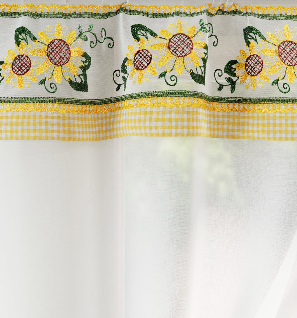 Brighten up your home with the charming Keswick window set. The design features embroidery and applique sunflower motifs, with matching tie backs. Crafted from high quality fabric for long lasting beauty and easy care. The window set provides light filtration allowing natural light to gently through whilst still providing privacy. The set includes an attached valance for easy installation using the rod pocket header.