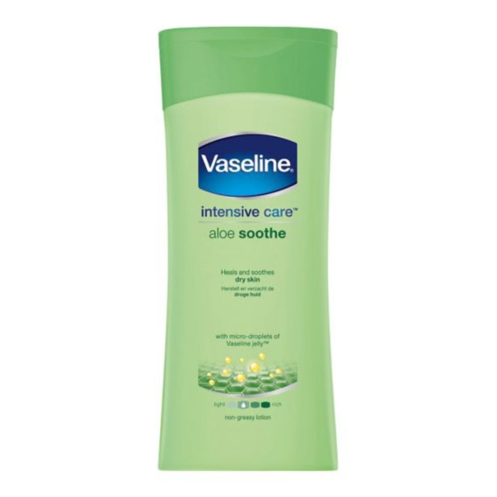 Vaseline Intensive Care Aloe Soothe body lotion hydrates skin and keeps it moisturised wtih Vaseline Jelly. Vaseline Aloe Soothe body lotion contains micro-droplets of Vaseline Jelly to lock in moisture to provide deep healing skin care. Our moisturising cream is clinically proven to moisturise deeply (within the stratum corneum) from the first application for noticeably healthier looking skin