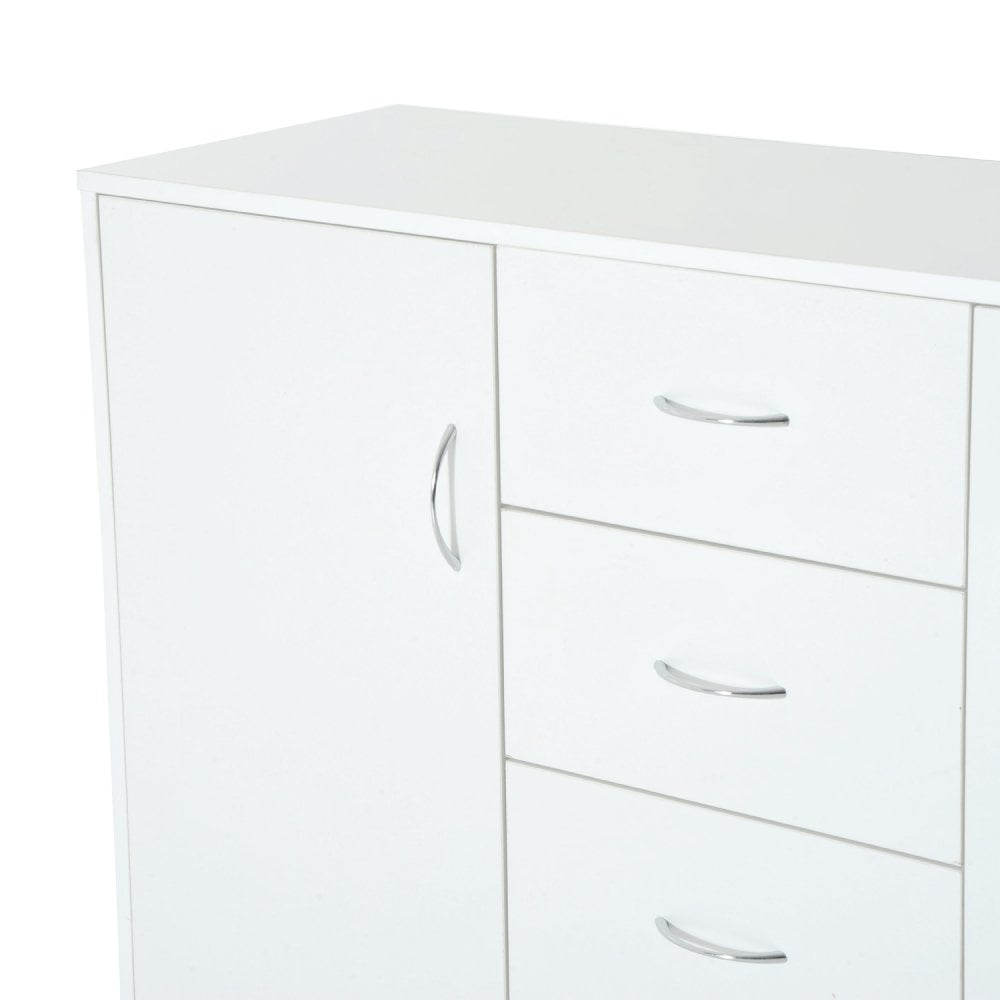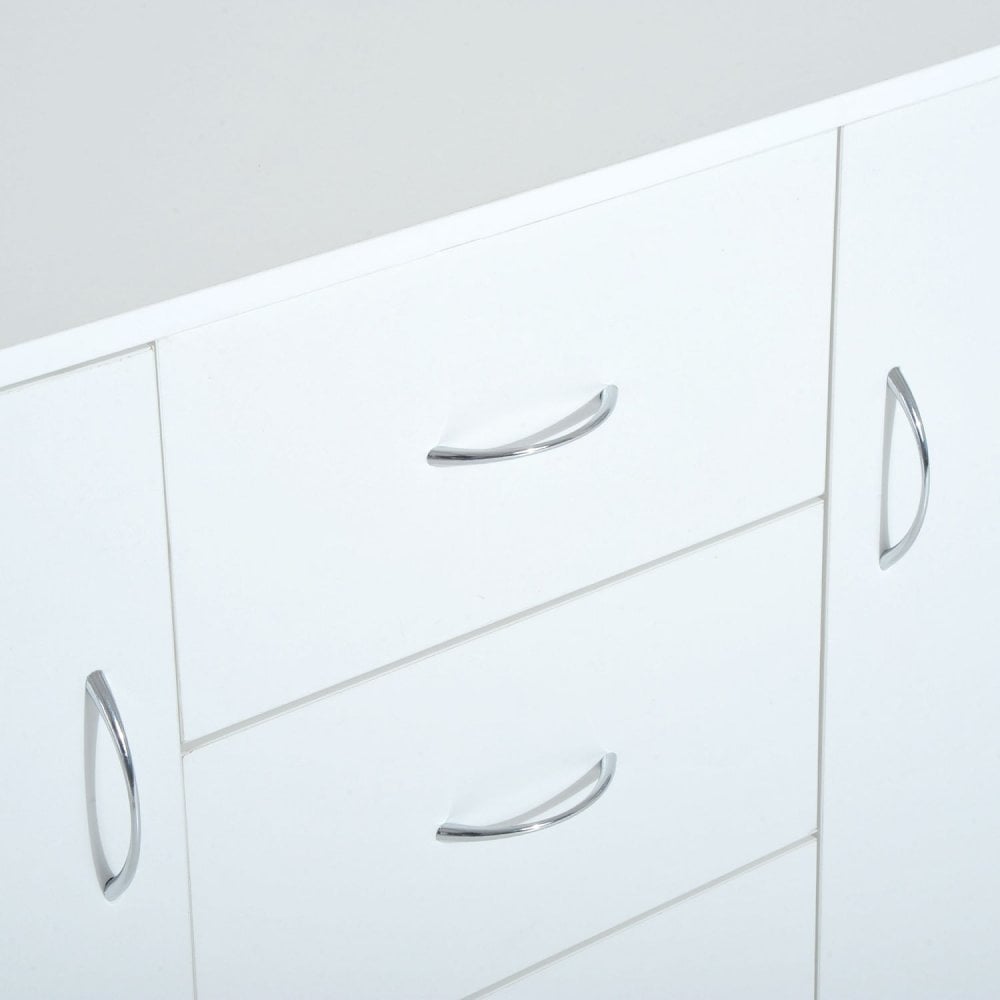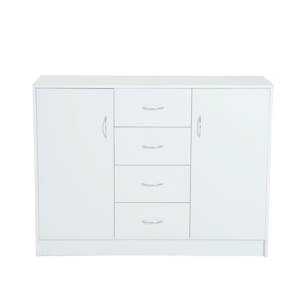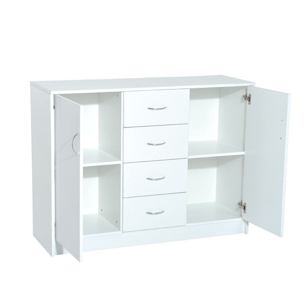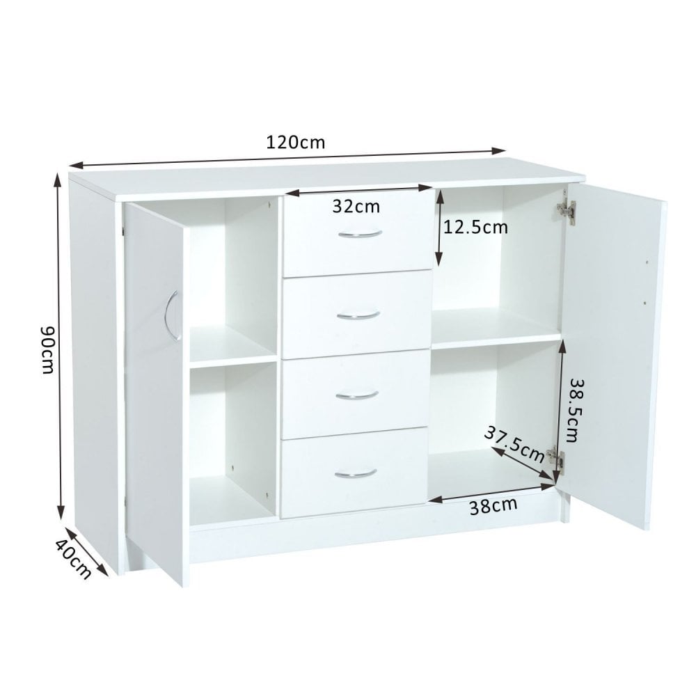This HOMCOM cabinet is an ideal solution for all your storage needs, organise all your items in the 4 drawers or in the two side cupboards. Each of the cupboards have an adjustable shelf making it even better to store larger items. Made from particle board the cabinet is easy to assemble and convenient for any use. It comes with a smooth poliched handles with the ability to match any other furniture and decor.