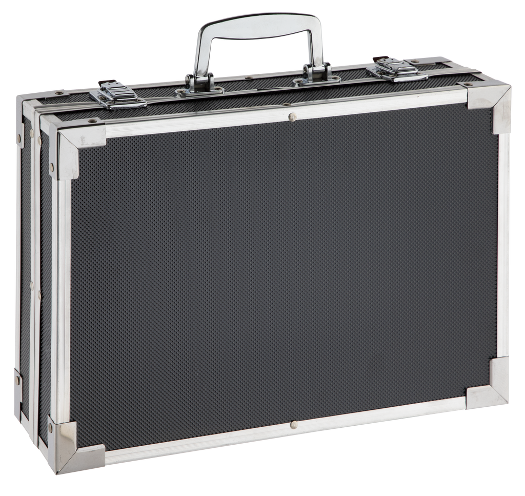 All contents are neatly organised in a sturdy, cantilever metal carry case.