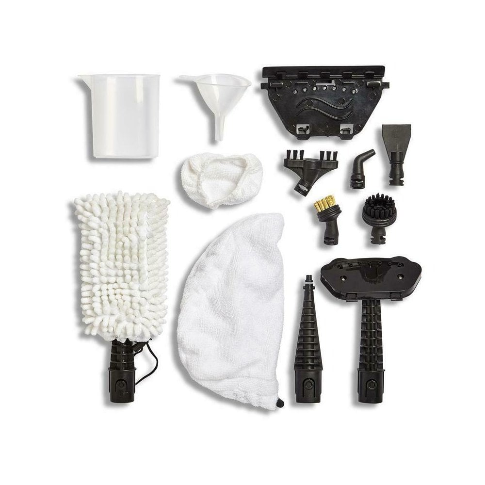 - Includes: 2 microfibre cloths, a carpet glide, brush tool, small and large brush, blinder, coral cloth, steamer cloth, funnel and cup, squeegee attachement, angled nozzle and a accessories adaptor