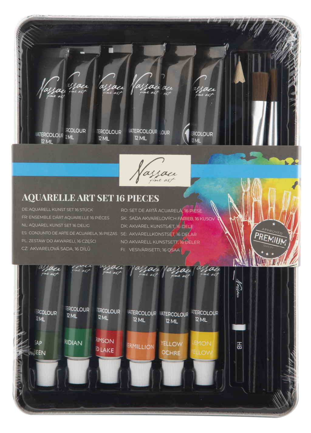 A fantastic starter set for any aspiring watercolourist, this 16-piece Art Set from Nassau Fine Art has everything you need to begin painting. This comprehensive kit includes a great selection of high-quality materials, all neatly presented in a durable and stylish metal tin.
