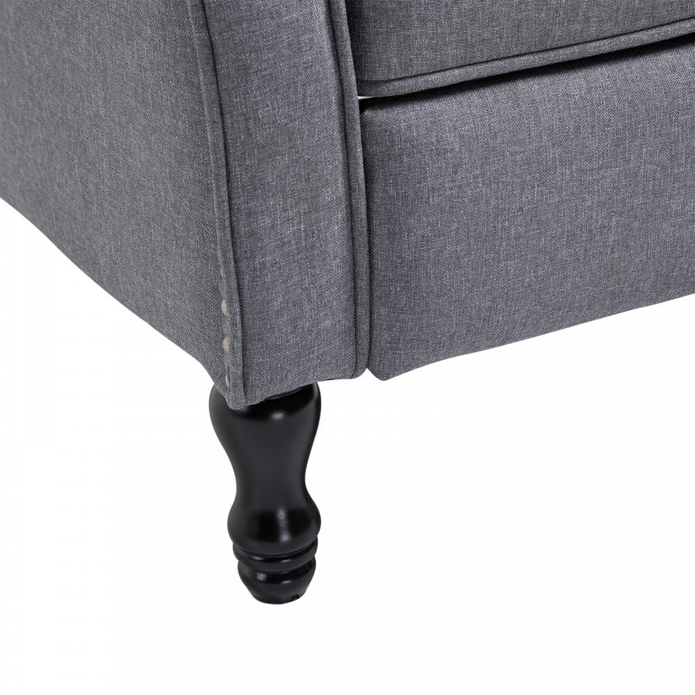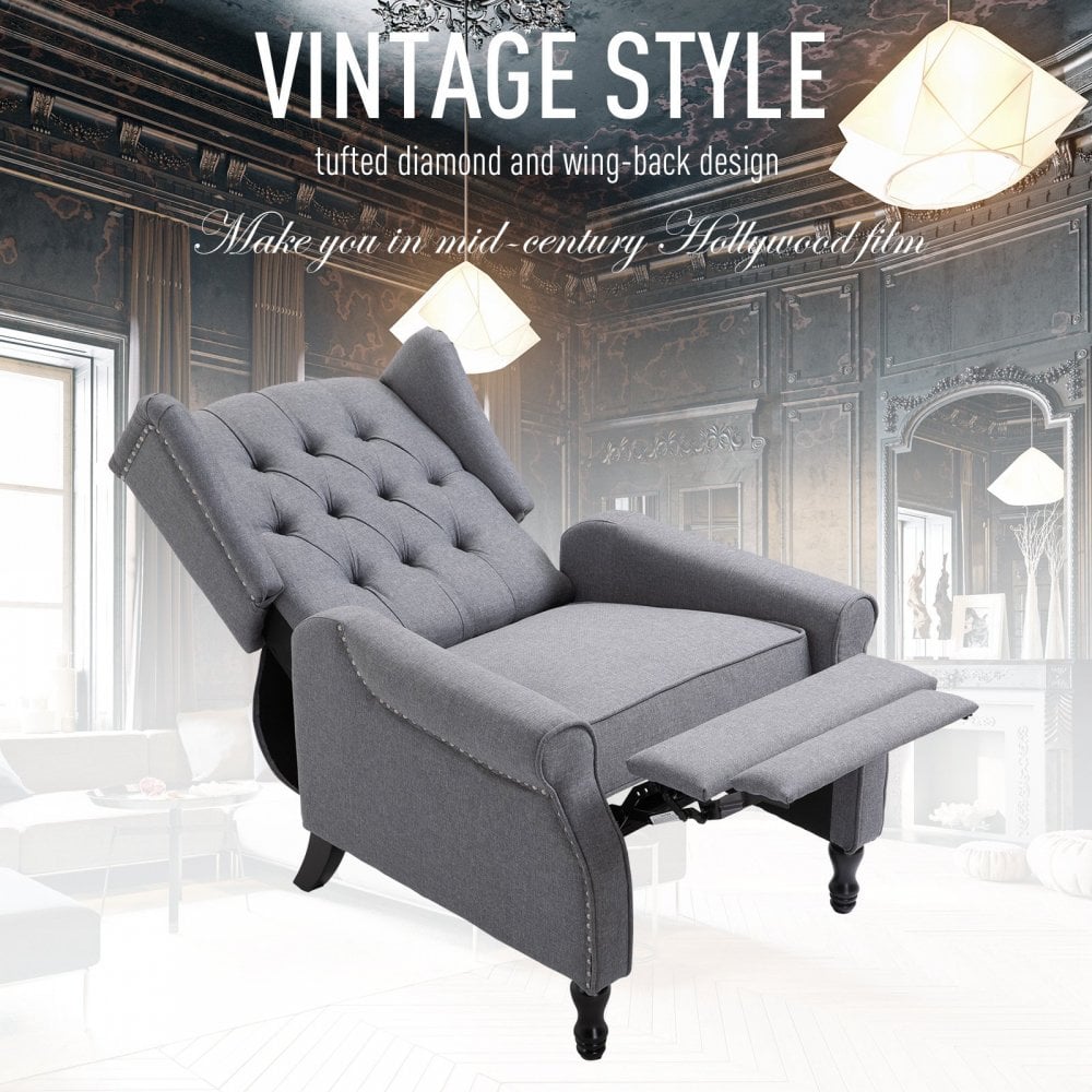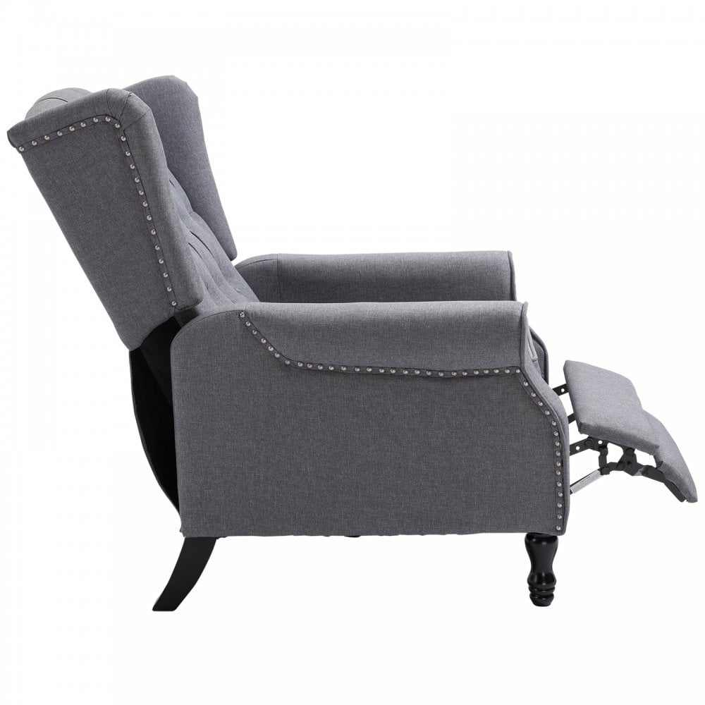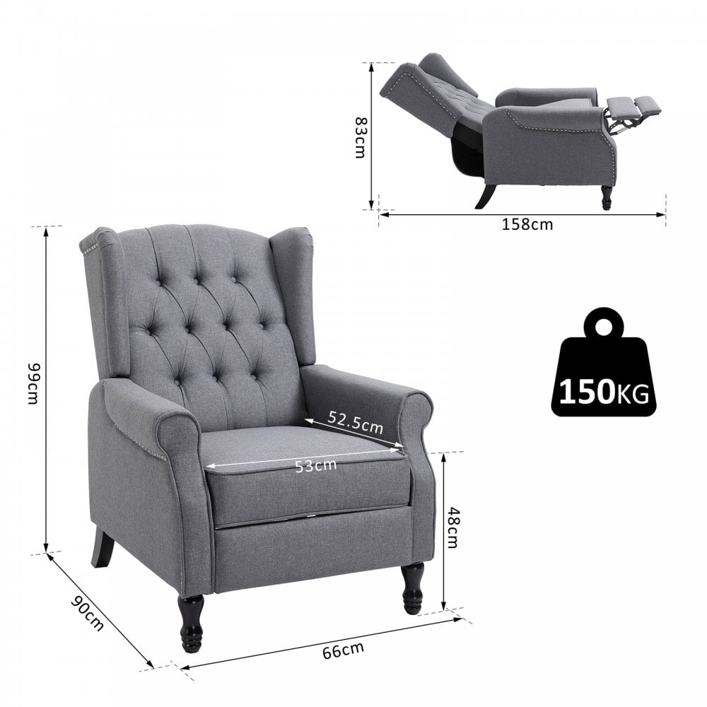Take your relaxation to the next level with this reclining armchair from . Light grey in colour for a beautiful addition to your home, the frame is made from a blend of metal and wood, making it durable, reliable and supportive for a weight up to 150kg. Tufted on the back for a vintage and traditional look, it is fitted with thick sponge on the seat, which, when combined with the (manual) 110°/130°/160° reclining angle, will provide you hours of comfortable sitting and resting with adequate body and posture support. It's finished with linen upholstery for easy maintenance and four solid wood legs to keep it stable and level on the floor. A modern take on a traditional look.