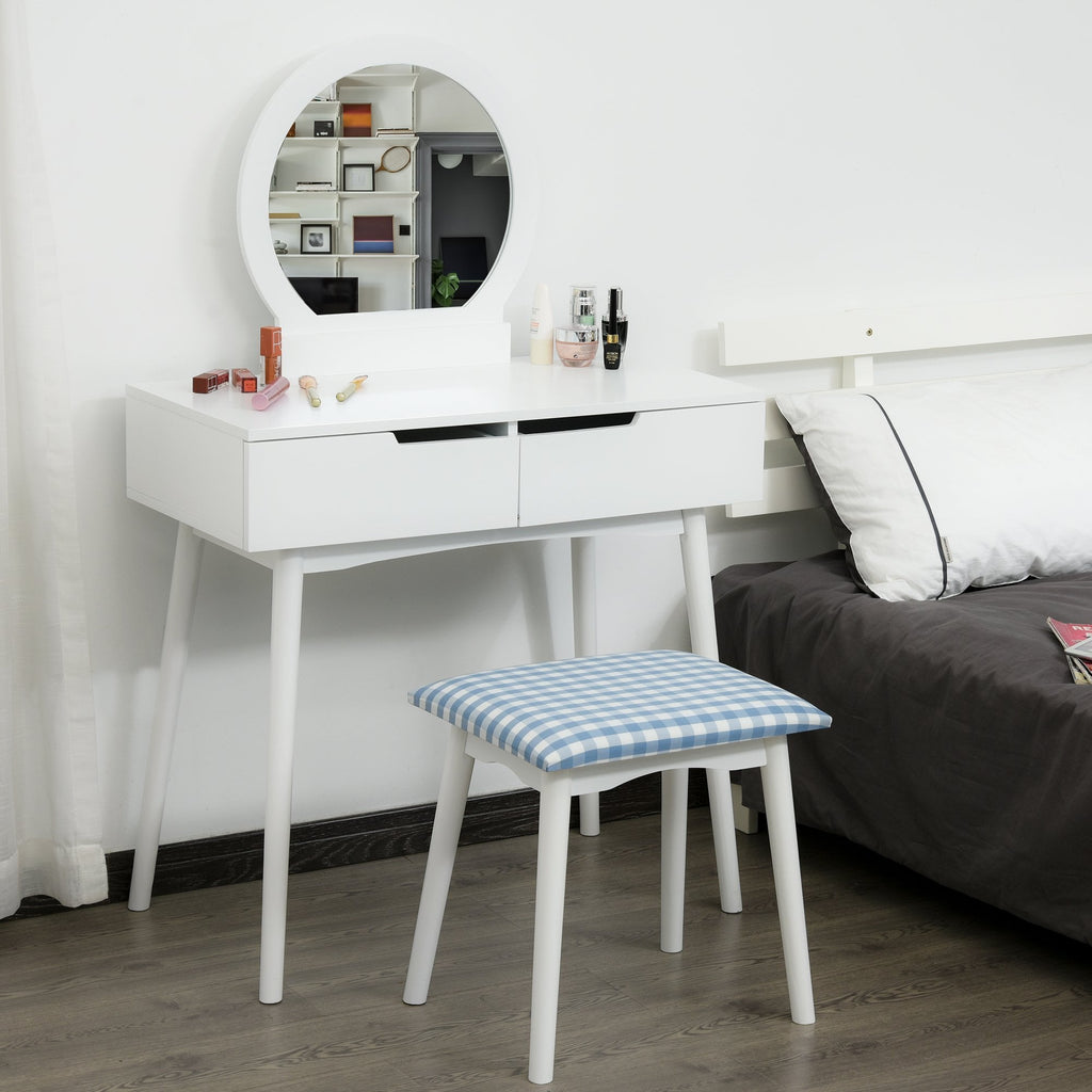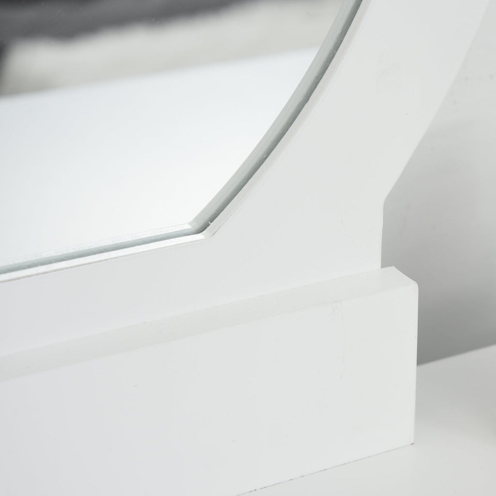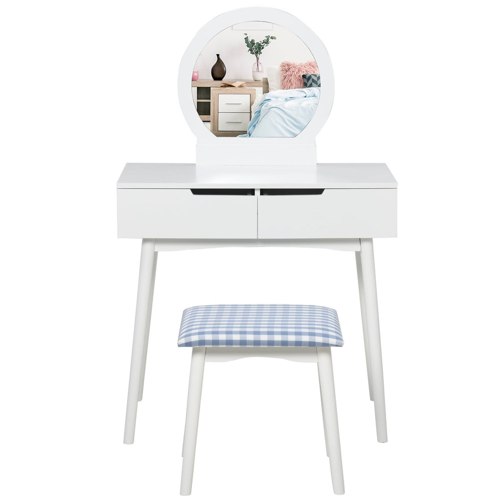 This HOMCOM Dressing table set is a great addition to any bedroom, comes with 2 drawers to keep jewellery, cosmetics or other items in order. Round mirror makes your makeup more convenient, making it an ideal place for you to get ready. The set is completed with a matching comfortable stool, this elegant and concise styled set is perfect for any bedroom and d?©cor. NOTE: The mirror is not detachable. If you do not install the mirror, the desktop will have holes on the surface.