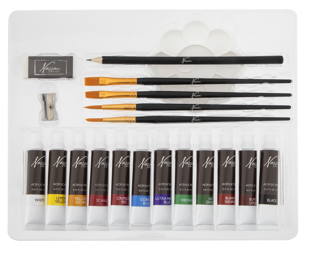 The perfect starter kit for any aspiring artist, this 21-piece Acrylic Art Set from Nassau Fine Art has everything you need to begin your creative journey. This comprehensive set includes a fantastic selection of high-quality materials, all beautifully presented in a stylish and sturdy cardboard gift box.