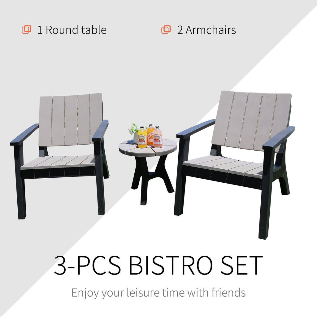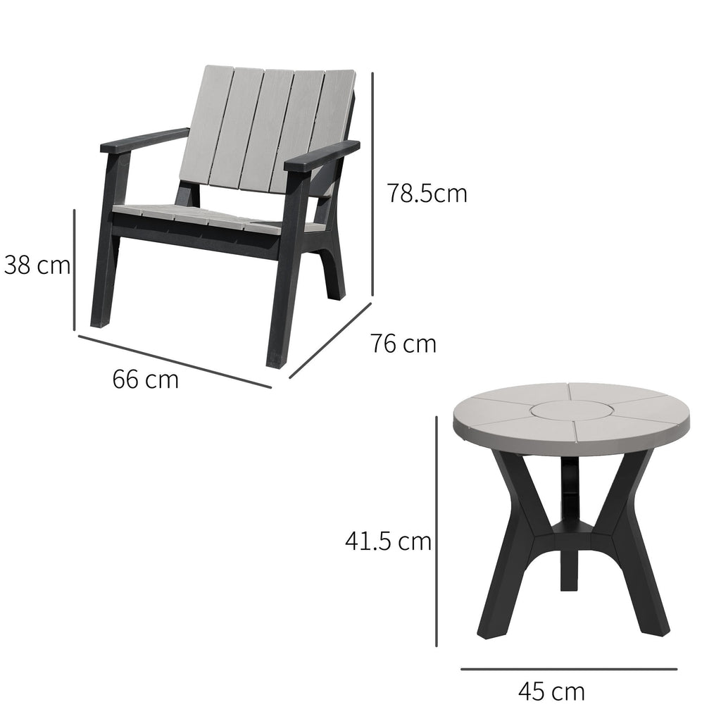 This garden coffee set from Outsunny includes two chairs and a round coffee table, which is an ideal addition to your patio, garden, lawn or any other outdoor areas. It offers a comfortable seating solution for you. With this set, you can enjoy your outdoor leisure times with your family members or friends. Stylish style table and chairs are allover construction with PP material for reliable using. Functional and stylish, this set is absolutely one you are looking for!