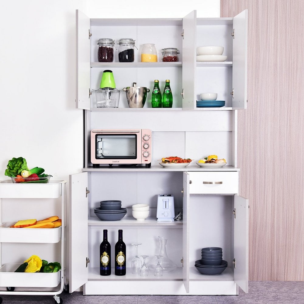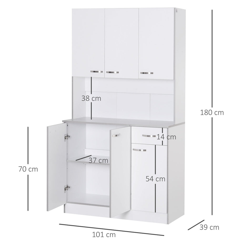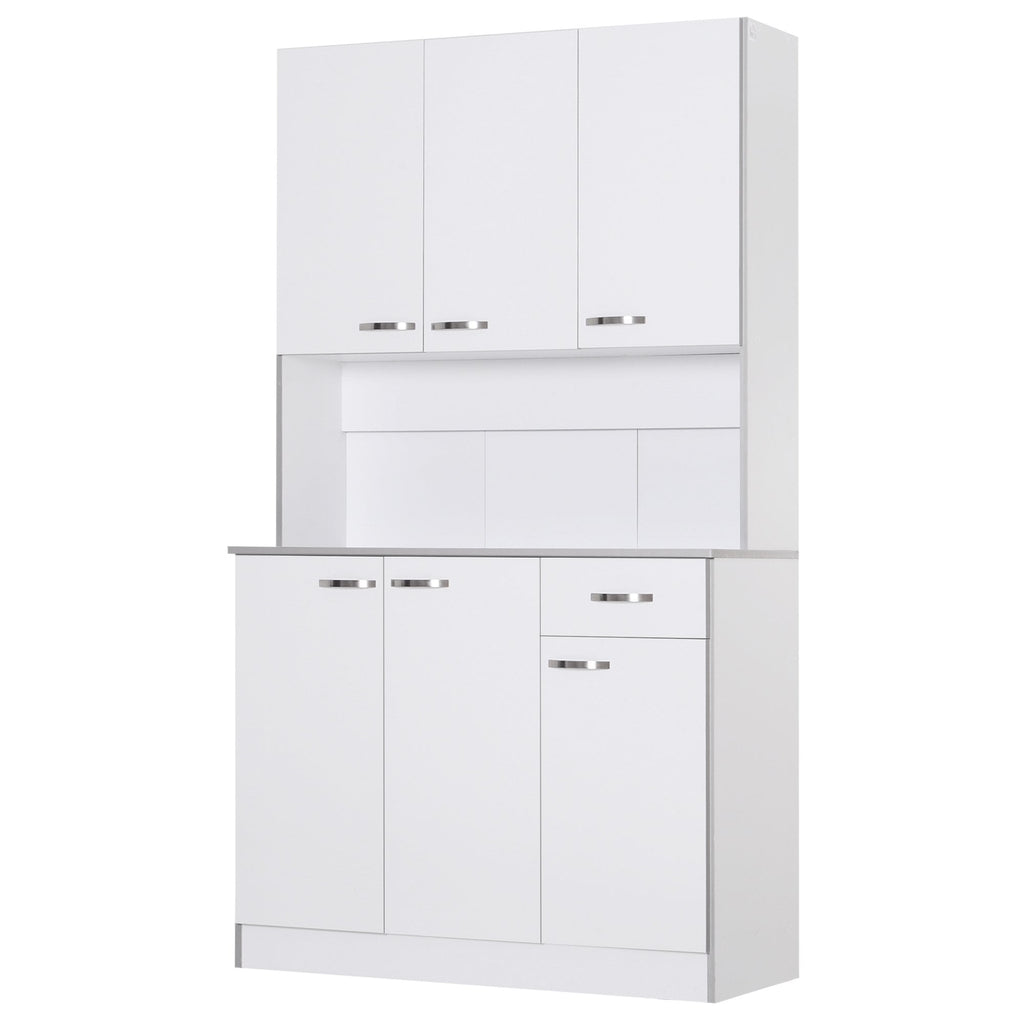 Creating a stylish storage option has never been so easy! This modern larder unit from HOMCOM fits nicely with any decor and can be used in the pantry, closet, garage to create additional storage. White coated engineered wood provides an easy to clean, smooth surface that will help keep your kitchen cabinet clean and sanitary.Multiple door cupboards, a pull out drawer, and an open countertop shelf provides spacious storage in this compact kitchen dresser.
