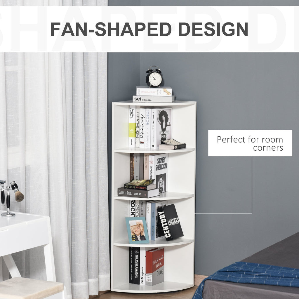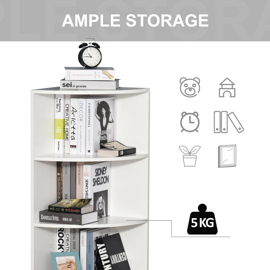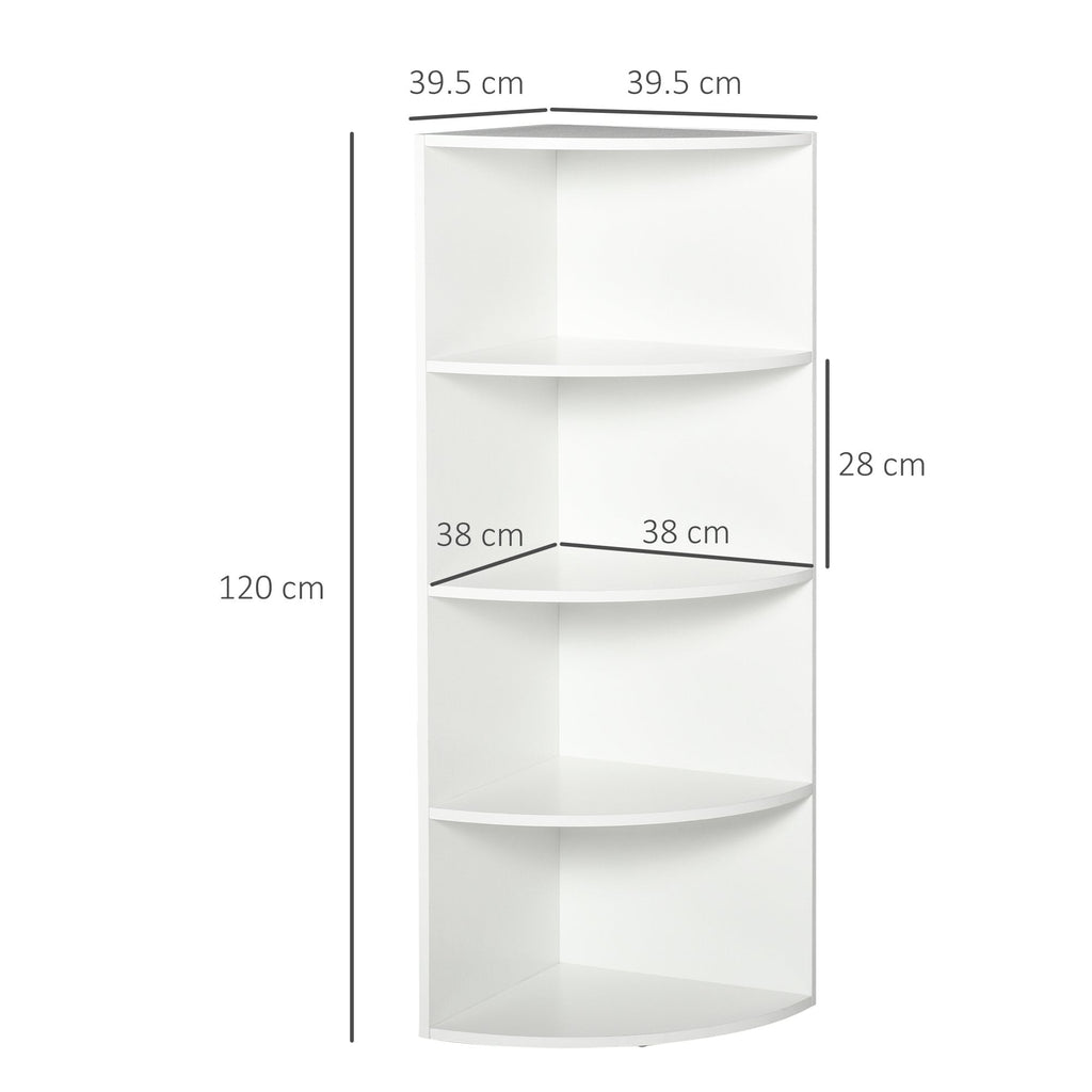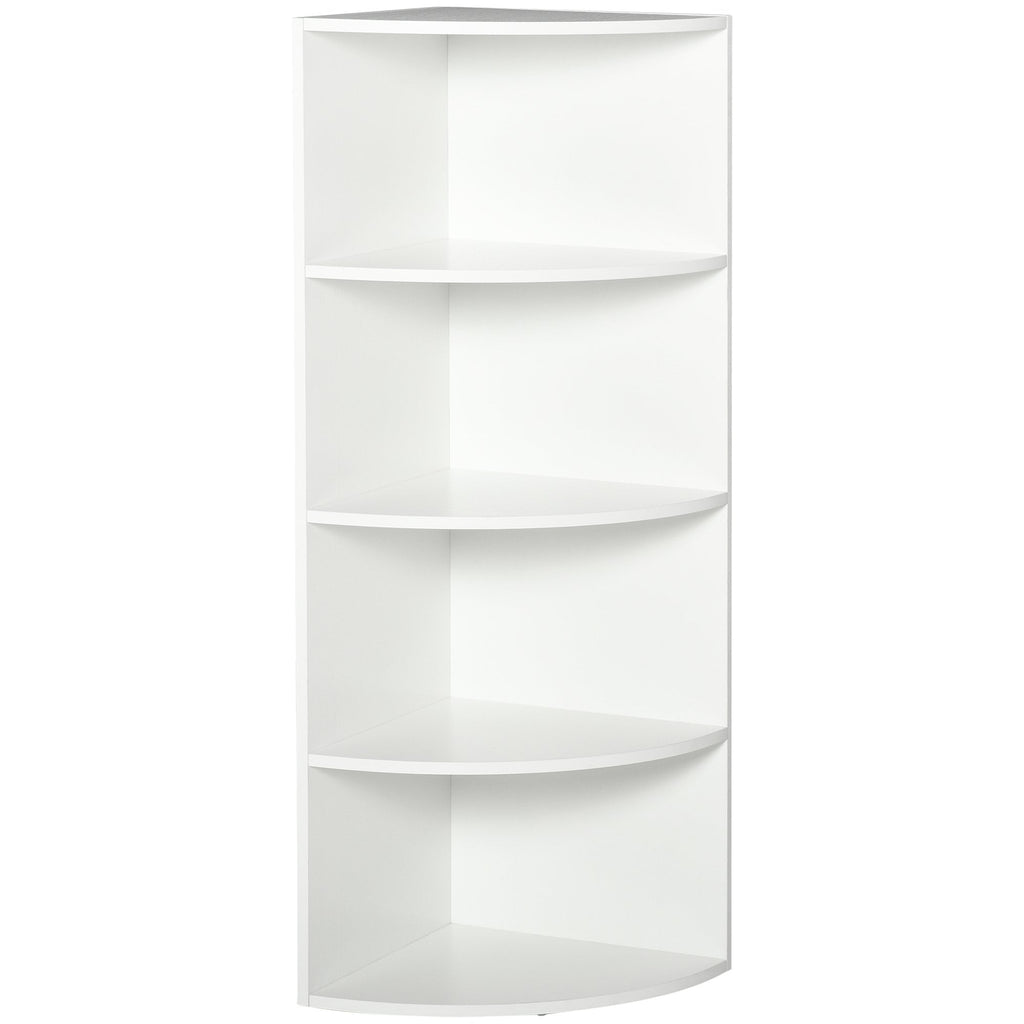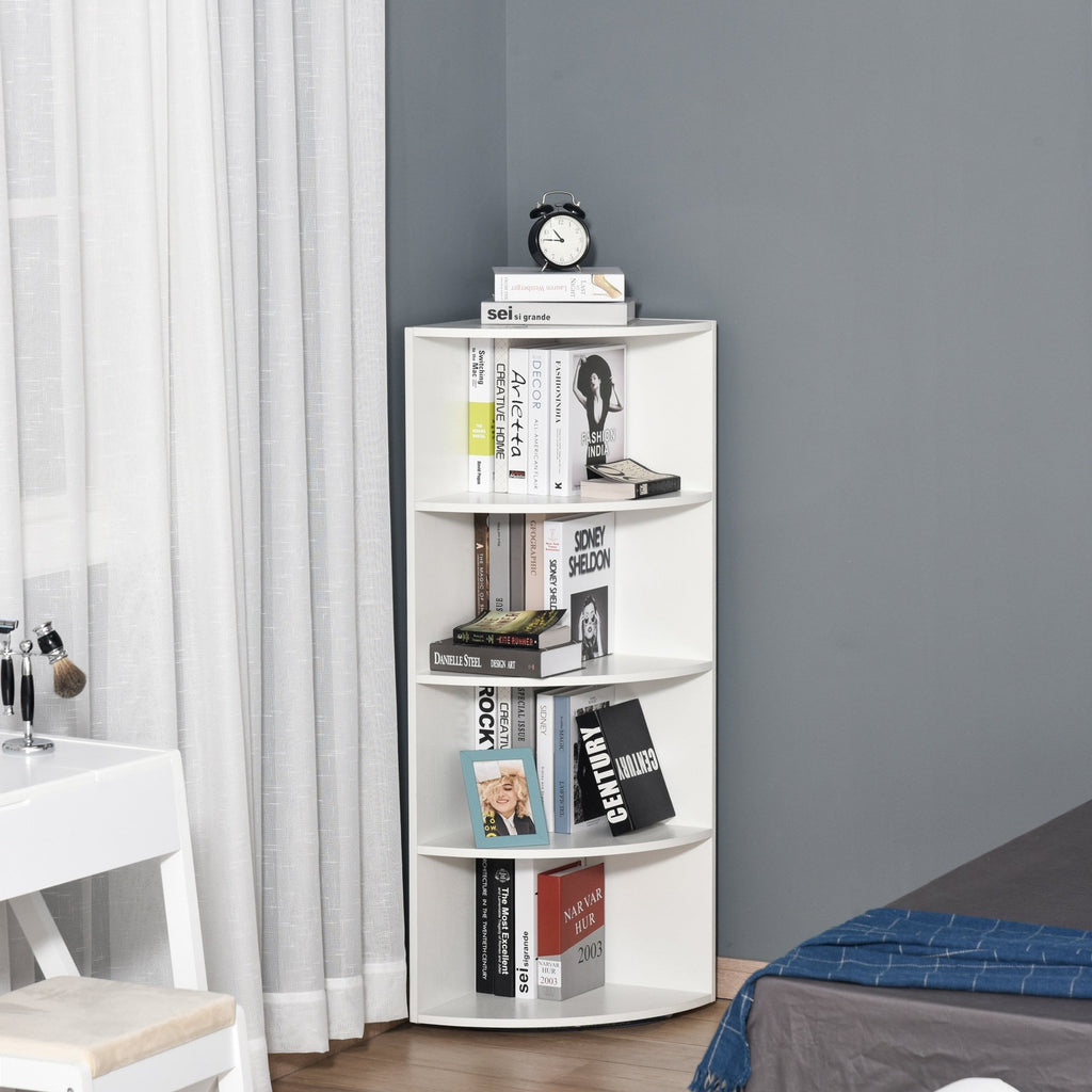 This corner shelf is ideal for those looking for extra storage without compromising on space. Crafted from thick particle board with a melamine surface so it's easy to clean and maintain, it features four spacious shelves to store and display books, photos, plants and more. In a fan-shaped design that fits neatly into corners, it is finished to blend in beautifully with your style decor. A perfect addition to living rooms, bedrooms and hallways.