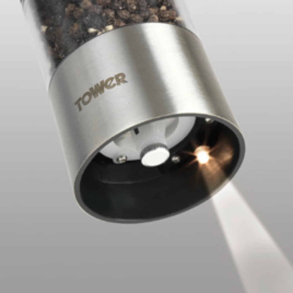 Add seasoning to soups, salads and other meals at the touch of a button with this stylish salt and pepper mill set. Suitable for all types of herbs and spices, these mills will efficiently grind peppercorns, rock salt and other common seasonings. The LED light on the base illuminates when in use, allowing you to accurately dispense your seasoning wherever you want it, while the acrylic viewing window allows you to easily monitor levels and refill when required. The salt and pepper mills in this set are complete with a soft-touch rubberised body, for a firm yet comfortable grip, and requires 4 x AA batteries (not included) to operate.