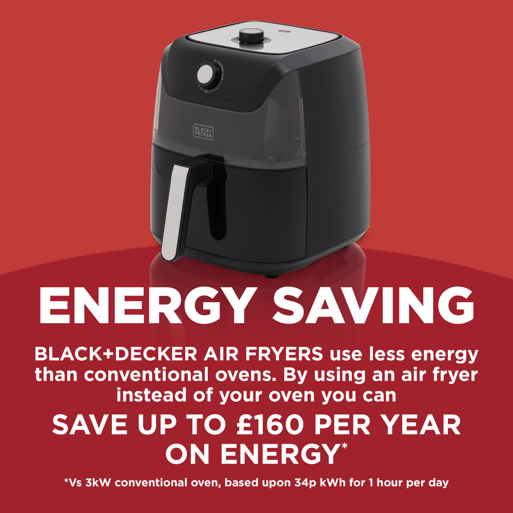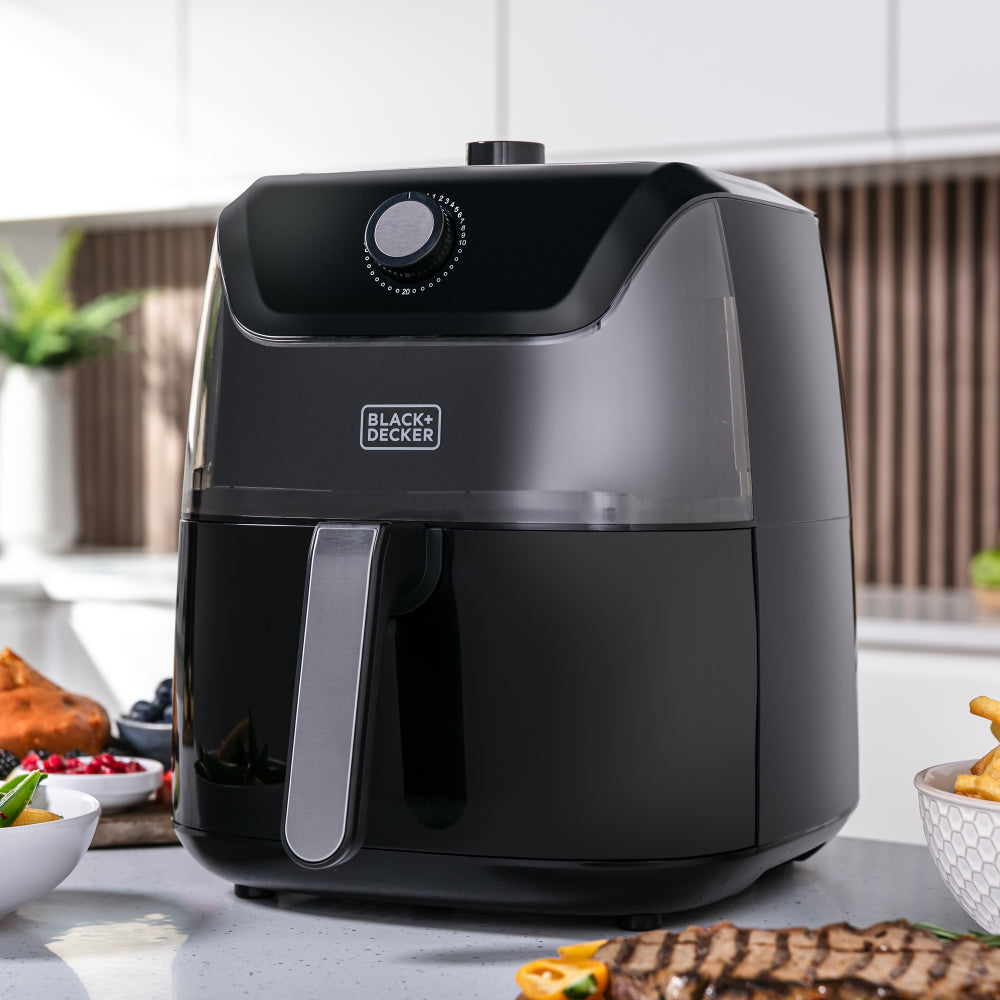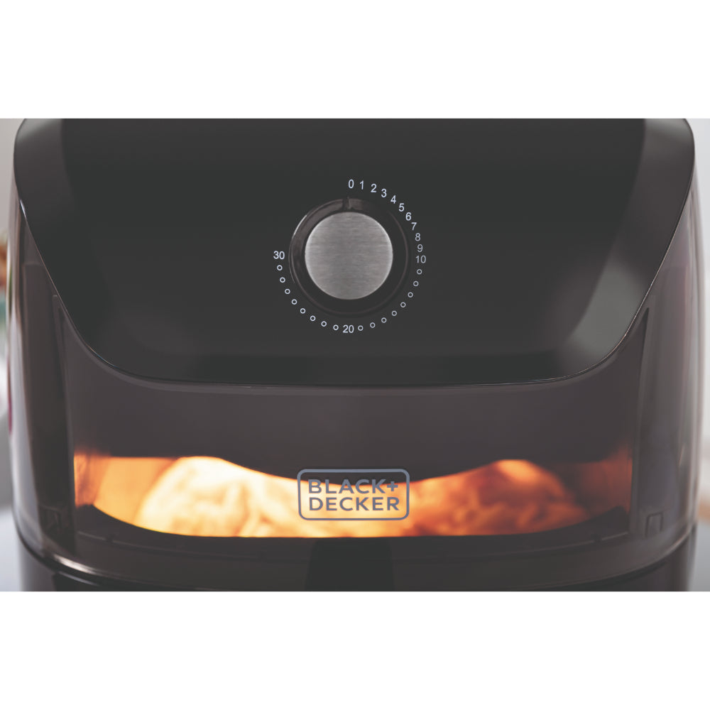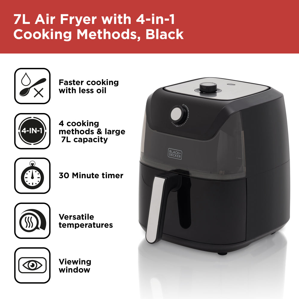 Fry, roast and bake delicious crispy chicken, golden chips and succulent meat for the whole family with BLACK+DECKER's 7L Manual Air Fryer. Less than one teaspoon of oil is required, all while keeping the same great taste, so you lose the fat not the flavour. Choose from 80-200C temperatures to evenly cook a wide range of ingredients, for deliciously healthy results. Quickly schedule the air fryer's cooking cycle using the 30-minute timer, so your food is ready for your family in no time. Keep an eye on your food through the large viewing window while cooking, without the need to pause or stop, to achieve the perfect crispy results. A pull-out drawer and removable non-stick frying basket require a simple hand wash for a sparkling clean.