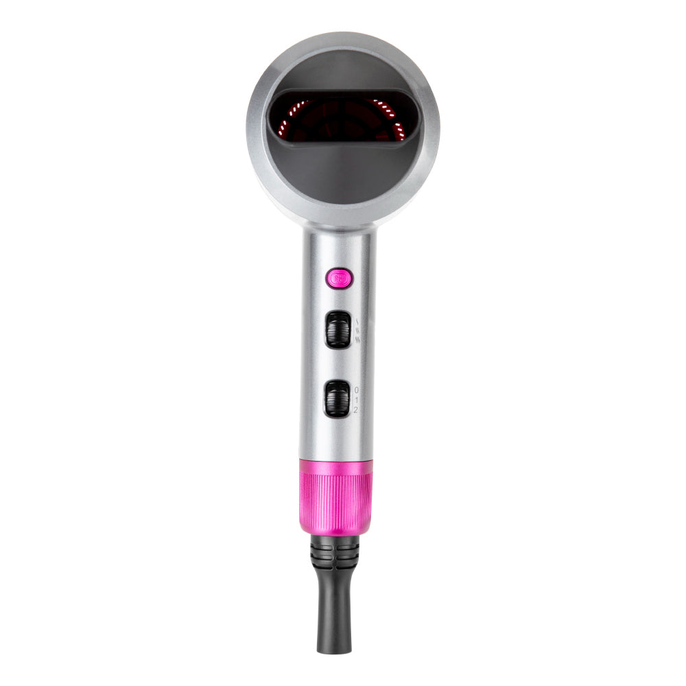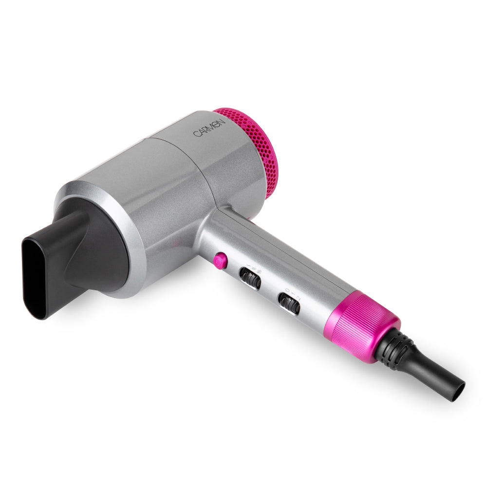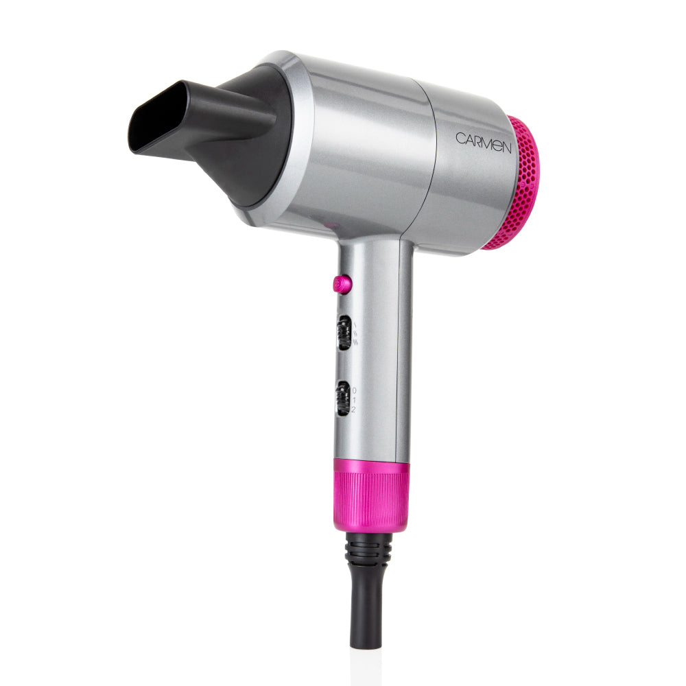 Blow dry your hair with a fast, flawless finish using the powerful Carmen Neon hair dryer. Flaunting a vivid neon pink and lightweight design, the accessory adds style and comfort to your hair-care routine. It features three heat and two speed settings suitable for styling hair of any length or thickness, with a cool temperature setting included to help secure your style in place for a longer-lasting blow dry. The slim concentrator nozzle attachment directs hot air onto sectioned hair to help you create a defined look. A removable filter is included to easily dispose of caught hairs and lint to maintain drying performance. Featuring a rear mirror to check your look at any time, the Carmen Neon dryer is an ideal all-in-one accessory for professionally styling your hair.