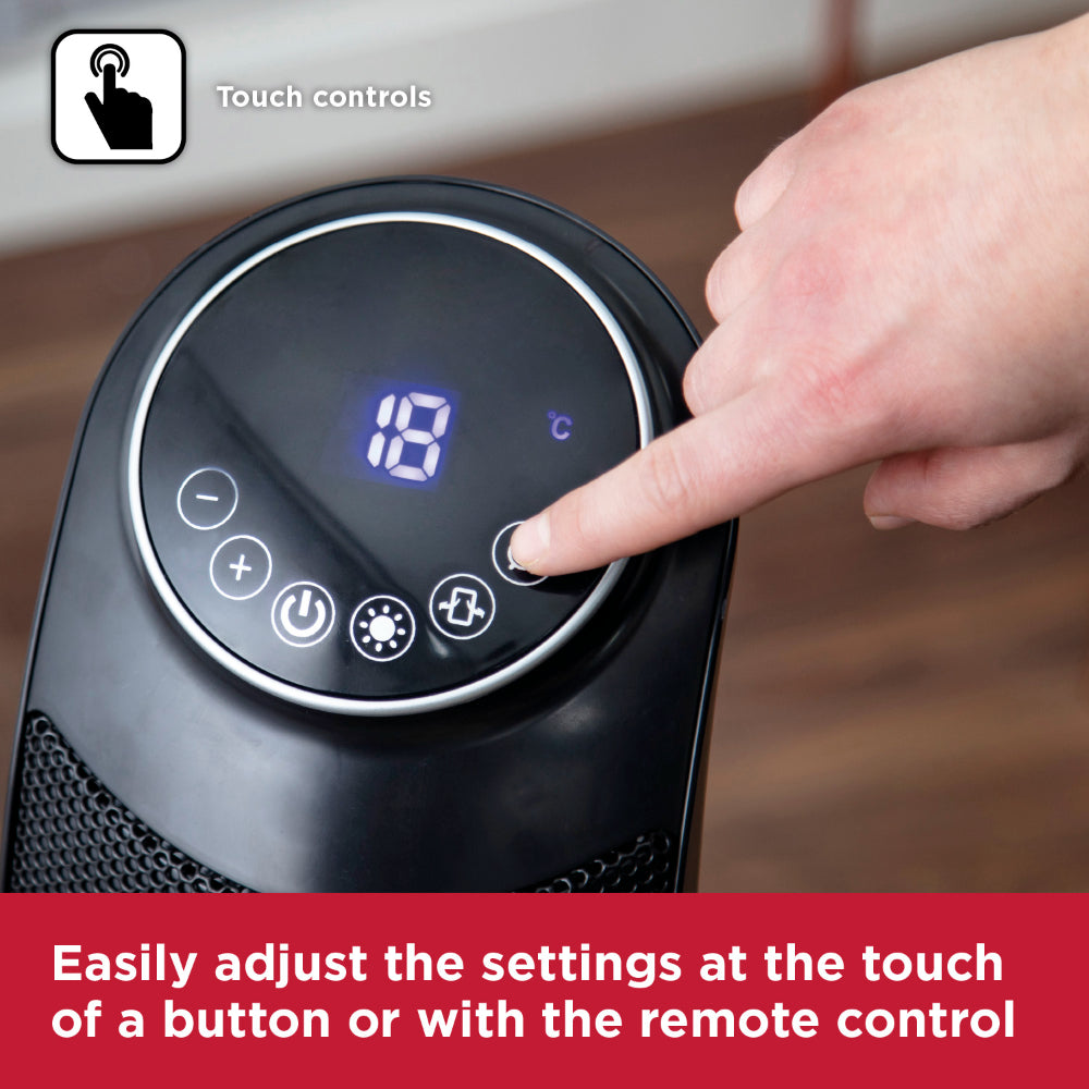 Rapidly heat or cool any room in your home with this powerful Black + Decker 2.2KW PTC tower fan heater. Offering a choice of three different wind modes - fan/warm/hot - which can be controlled using the LED touch-control panel, this heater is both versatile and efficient for use all year round. The easy-to-use touch-control panel allows you to adjust the temperature between 10 and 49C. You can also programme the 8-hour timer for a time that suits. Central to this heater's efficiency is the ceramic stone element. The hot air generated by the heater is preserved in the element which helps to maintain a consistent temperature while using less energy. You can direct the heated air flow with the oscillation feature which provides heat coverage across a 60 angle. Overheat protection provides safety and complete peace of mind. If you want to move your heater around the home, the integrated carry handle allows for easy manoeuvrability from room to room.