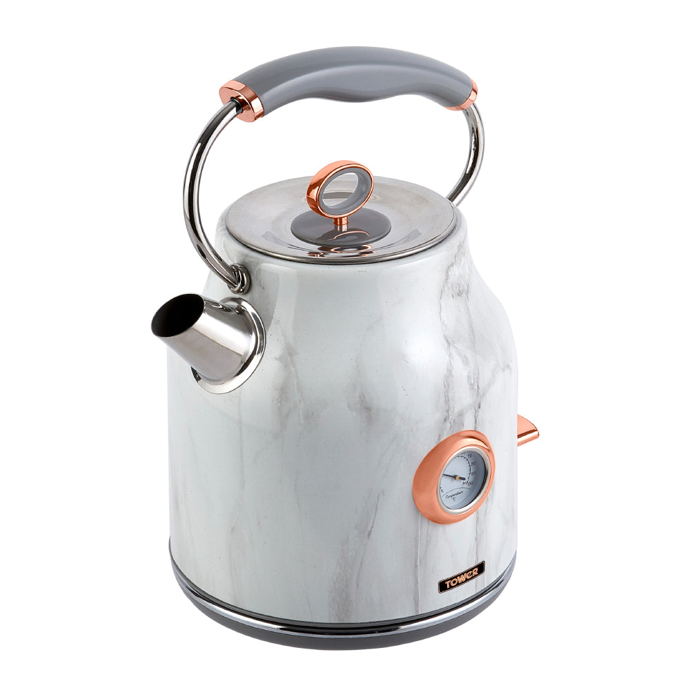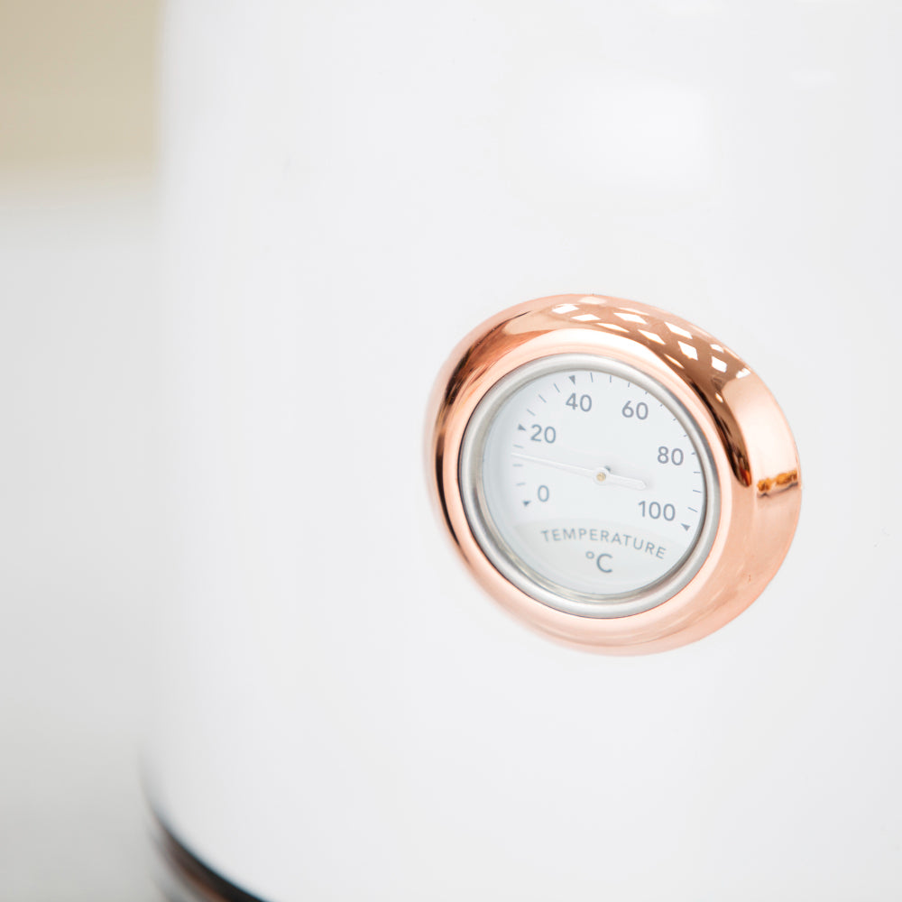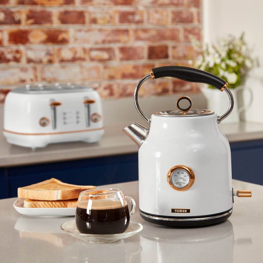 Serve up a tasty brew with this Tower 3.kW rose gold and white cordless kettle with temperature gauge. The 1.7L capacity lets you make up to 7 cups of tea or coffee from a single boil, perfect for playing host to family and friends. With rapid boil technology, the kettle boils in minutes so you can enjoy your beverage in no time, while the quiet boil function ensures minimal noise disruption. Featuring quality stainless steel housing and rose gold accents, this kettle provides a subtle yet tasteful addition to your everyday kitchen appliance. Includes a removable limescale filter, which makes it easy to clean and maintain the kettle. Comes with Tower's 3 year warranty.