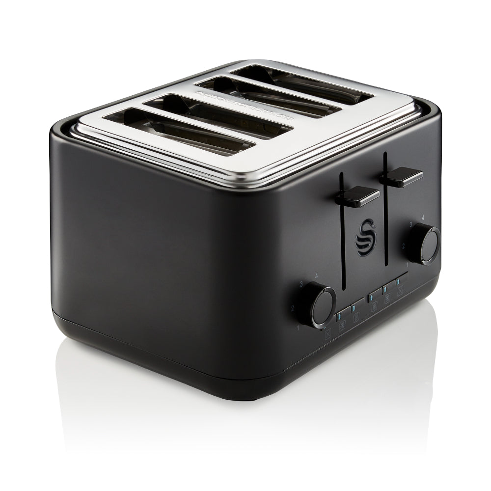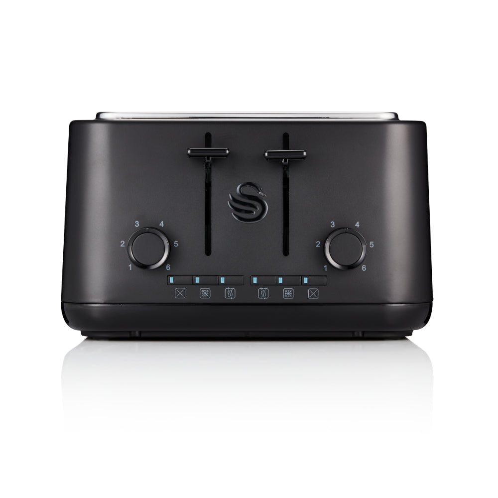 The sleek and contemporary Swan Stealth toaster is the perfect appliance for guys on the go, busy kitchens, and those looking for high performance without having to compromise on style. Its sleek and streamlined design adds a touch of understated class to your kitchen, thanks to the luxurious matt black finish. Top-level design combined with high functionality makes the morning breakfast rush a breeze. The 4-slice capacity means this is the perfect toaster for couples, busy households, or workplaces. Impressive browning controls and adjustable cooking times allow you to toast your bread exactly how you like it every time, and with independent controls for each side, you can adjust the controls on either side based on your preference. The handy removable crumb tray helps to keep your worktop clean and crumb free, and it slides out so you can dispose of all your crumbs quickly and easily. Wide slots and self-centering guide ensure an even brown on bread of all sizes, bagels, crumpets, muffins, and much more.