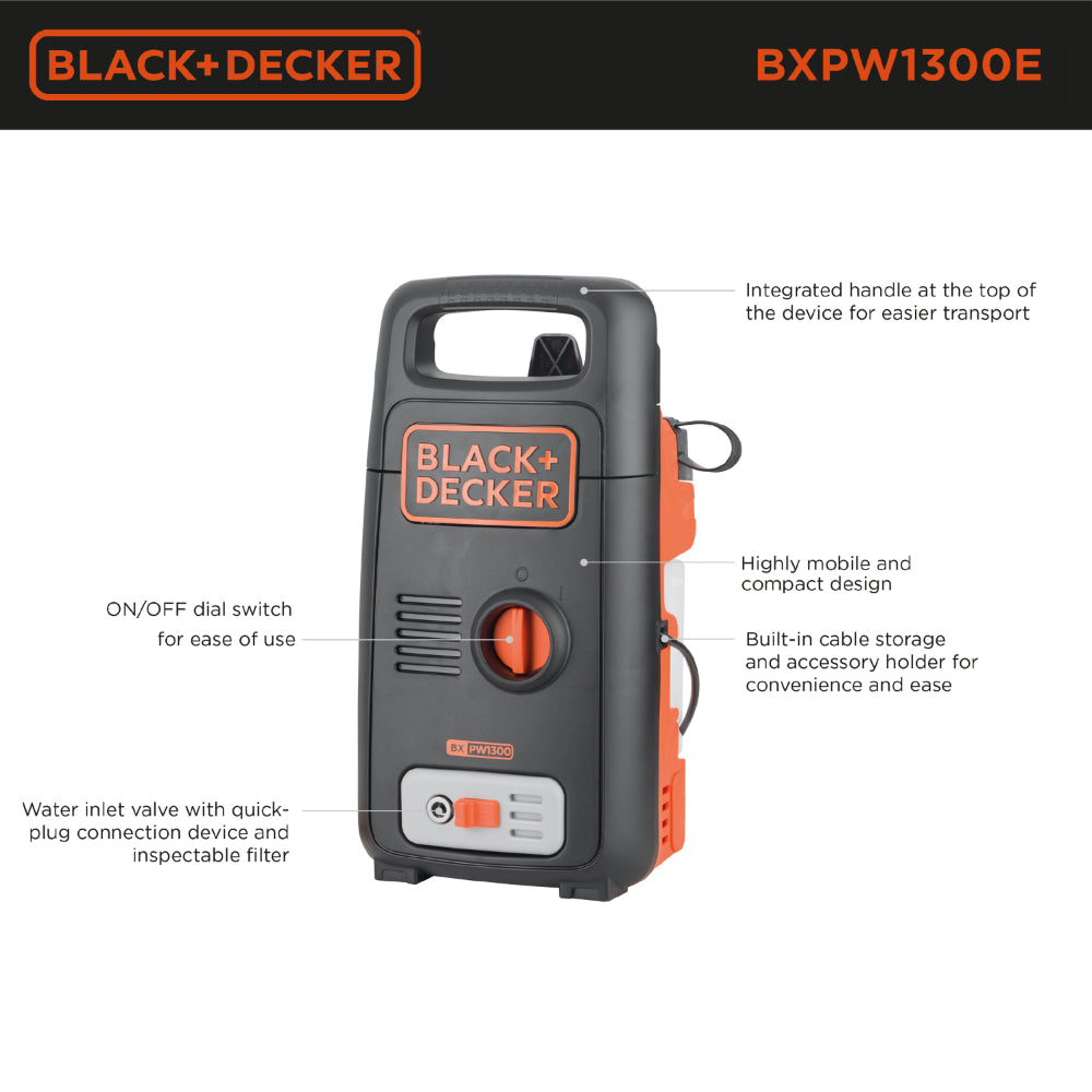 The new BLACK+DECKER range of high pressure washers is unbeatable for cleaning many outdoor household surfaces and for washing cars, bikes, tools and garden furniture. This pressure washer packs a powerful punch with a 1300W power output and 100 bar pressure. Includes a Lance Extension that allows the high pressure washer to be used for washing even the highest, most inaccessible surfaces, simplifying operations for the use. Its small size and convenient accessory stowage on the rear make it easy to store in even tight spaces.