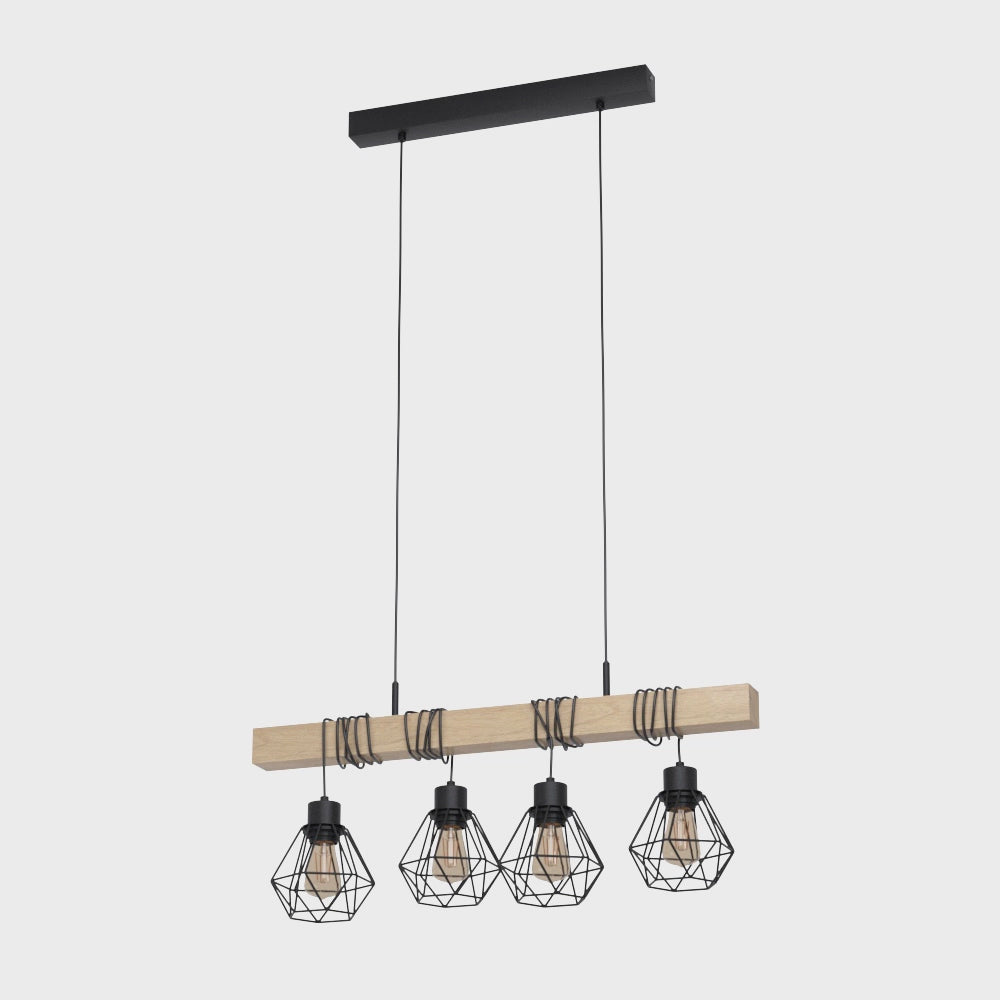The TOWNSHEND 5 pendant light features a wooden beam with four black wire lampshades. These geometric metal frames have an adjustable height simply by winding or unwinding the cables. With a mix of pine wood and metal, the pendant light blends seamlessly with interior design trends such as vintage and industrial. The pendant light provides modern lighting for any space, whether in the living room or over a long table in the dining room. The product has E27 lamp holders and requires 4 x E27 lightbulbs, which are not included.