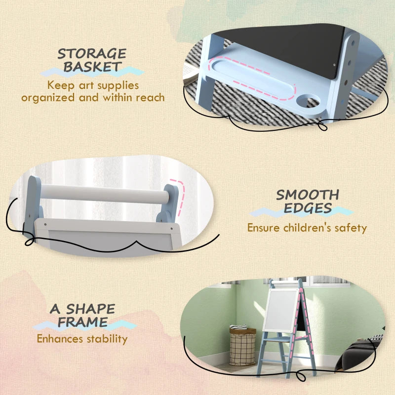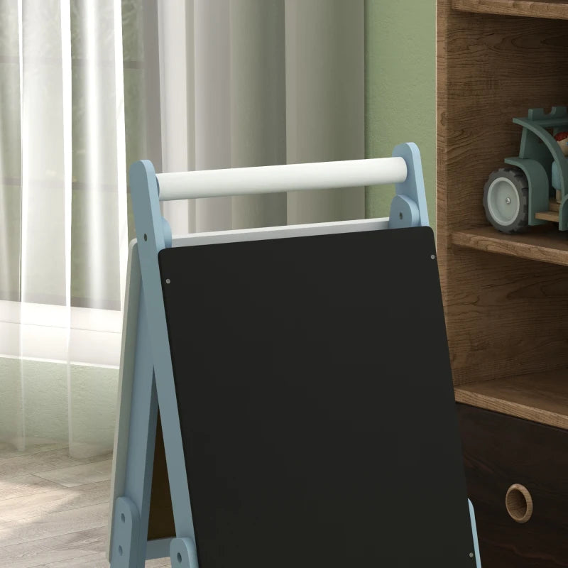 Unleash your child's imagination with our AIYAPLAY kids easel. Featuring a blackboard, whiteboard and top paper roll, there's lots to do to ignite their artistic genius. With different height options, it's suitable for different ages – as your child grows taller, they can still use this easel. Made with a sturdy A-shape frame, it use pinewood and MDF for extra durability. Finished with a storage shelf, keeping supplies organised. Let their creativity soar and bring their ideas to life!